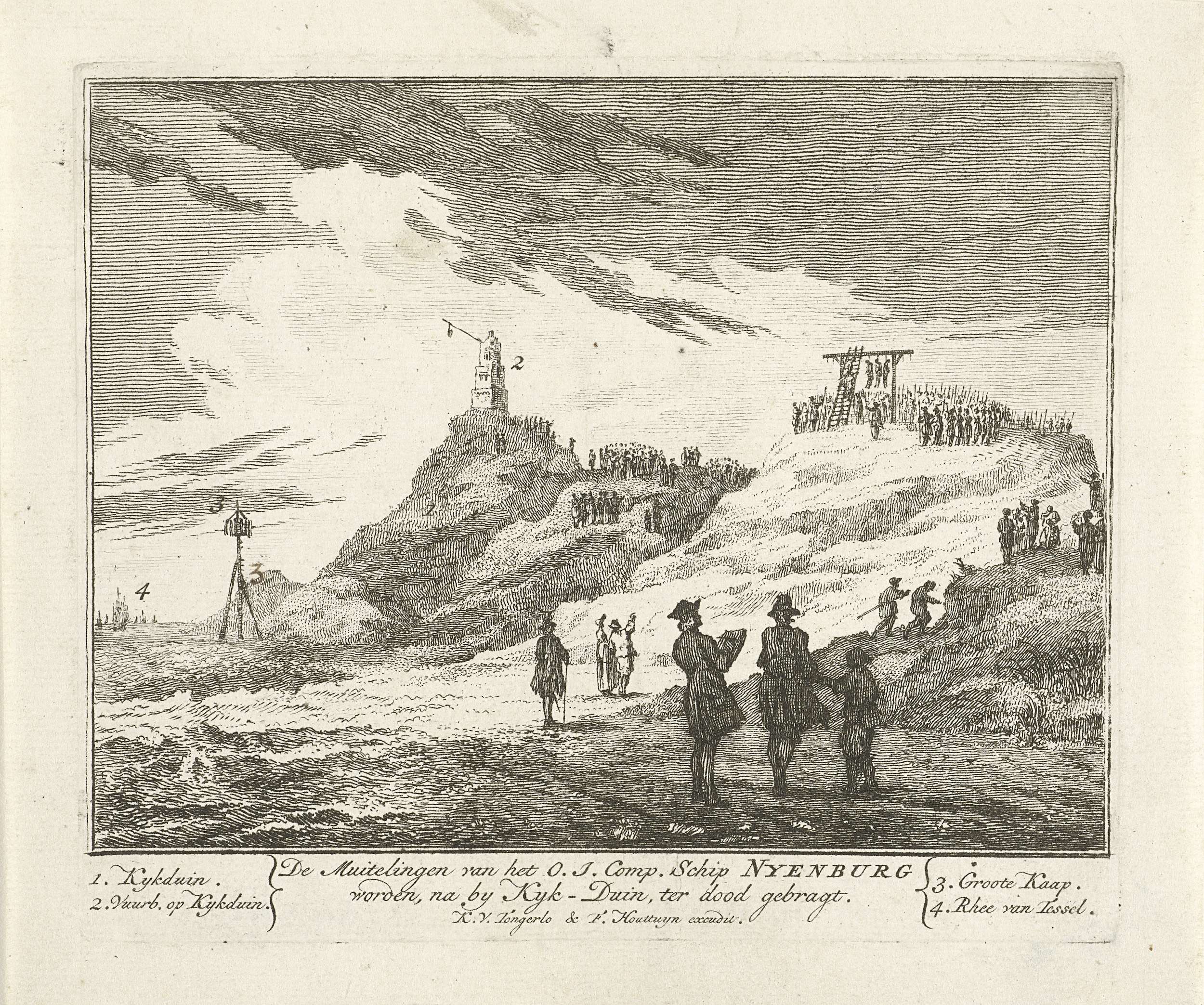 De veroordeelde muiters van het koopvaardijschip genaamd de Nijenburg worden in de duinen bij Huisduinen ter dood gebracht. In de verte een menigte rond de galgen bovenop een duin, links de hoge duin genaamd Kijkduin waarop een vuurbaken en in de verte de rede van Texel. Op de voorgrond enkele personen waaronder een tekenaar. In ...