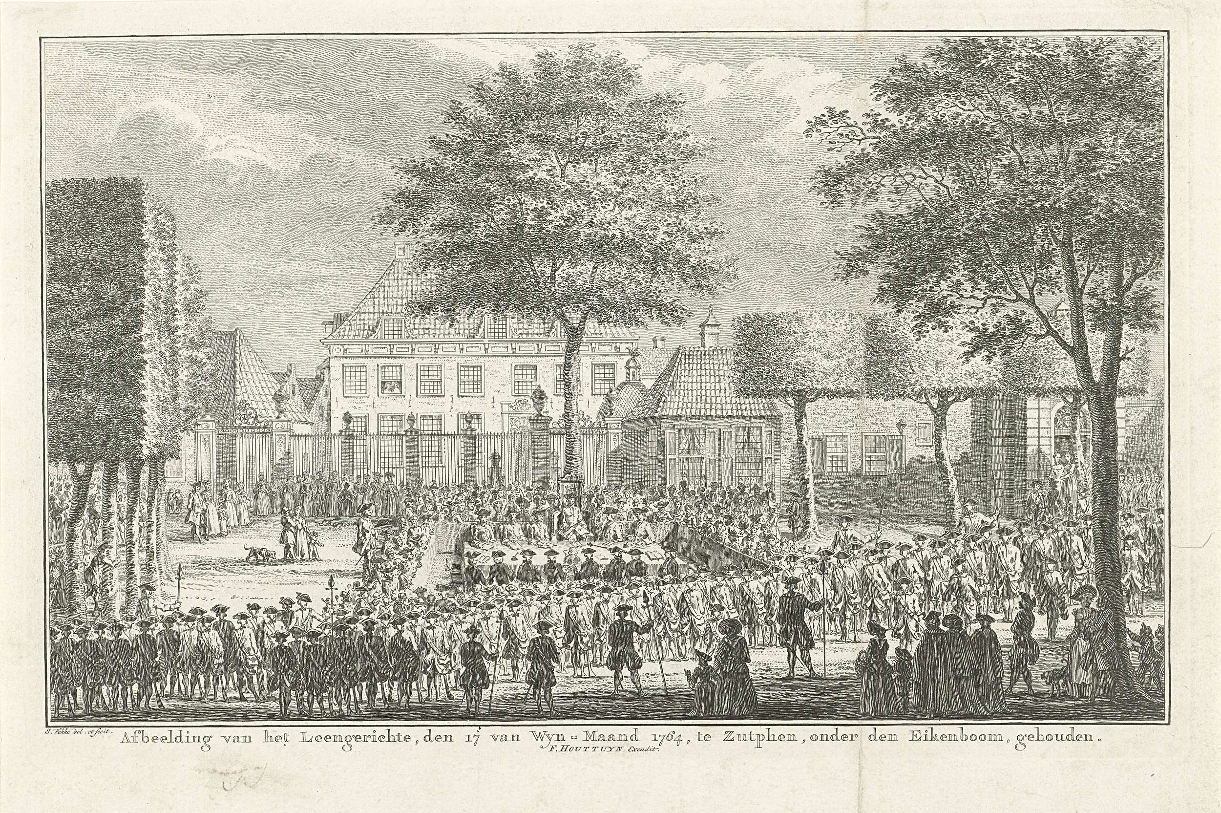 Bijeenkomst van het leengerecht in de open lucht onder de eik, 17 oktober 1764. Te midden van het 's Gravenhof te Zutphen zitten leden van het gerechtshof voor leenzaken aan een tafel. Burgers en leden van de schutterij hebben zich rondom de met een omheining afgeschermde tafel opgesteld om deze bijeenkomst te kunnen volgen.