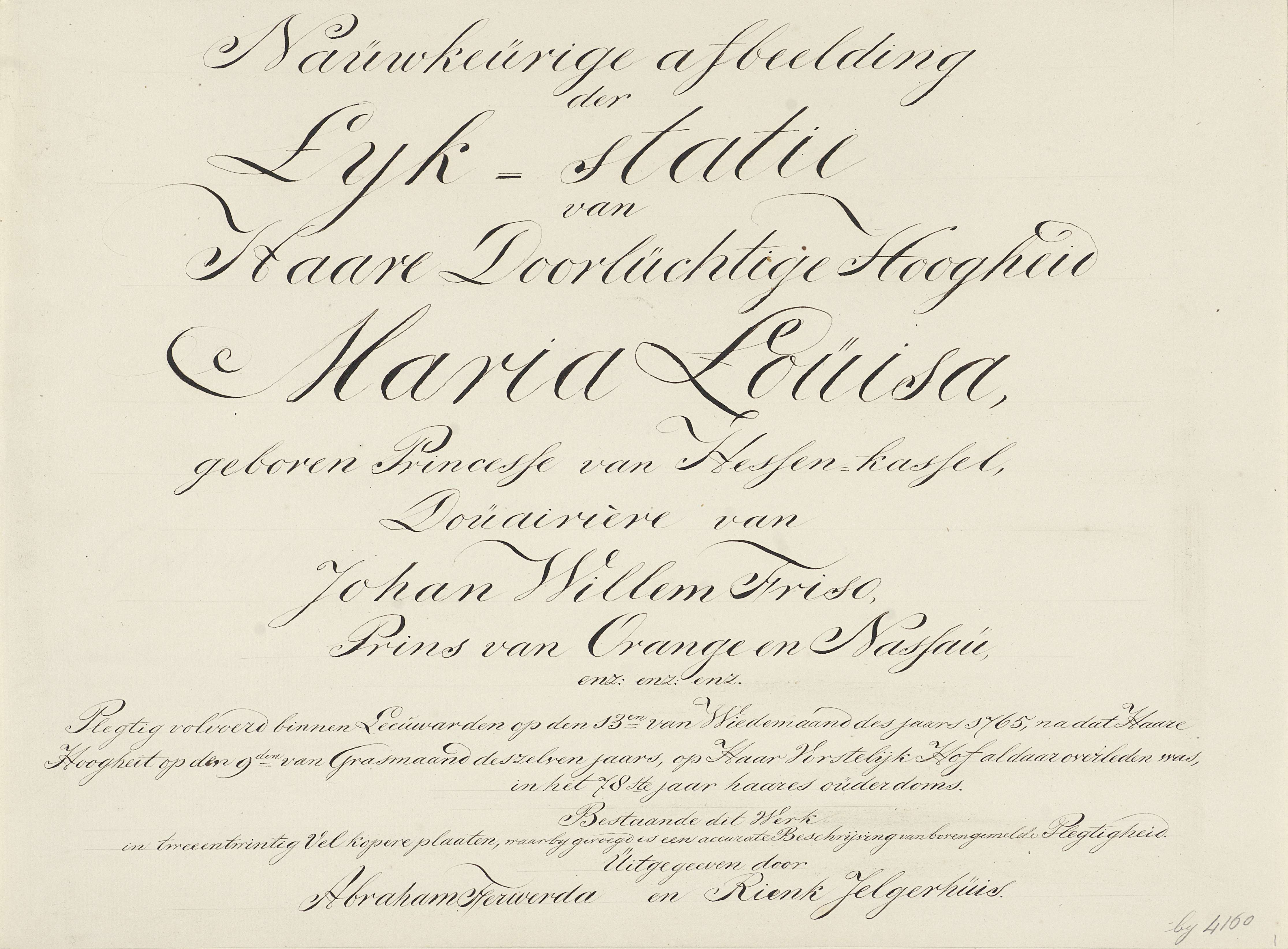 Handgeschreven titelblad voor de serie platen van de begrafenis van prinses Maria Louise te Leeuwarden op 13 juni 1765. Waarschijnlijk negentiende-eeuwse afschrift naar de bij dit exemplaar ontbrekende originele gedrukte tekstbladen.