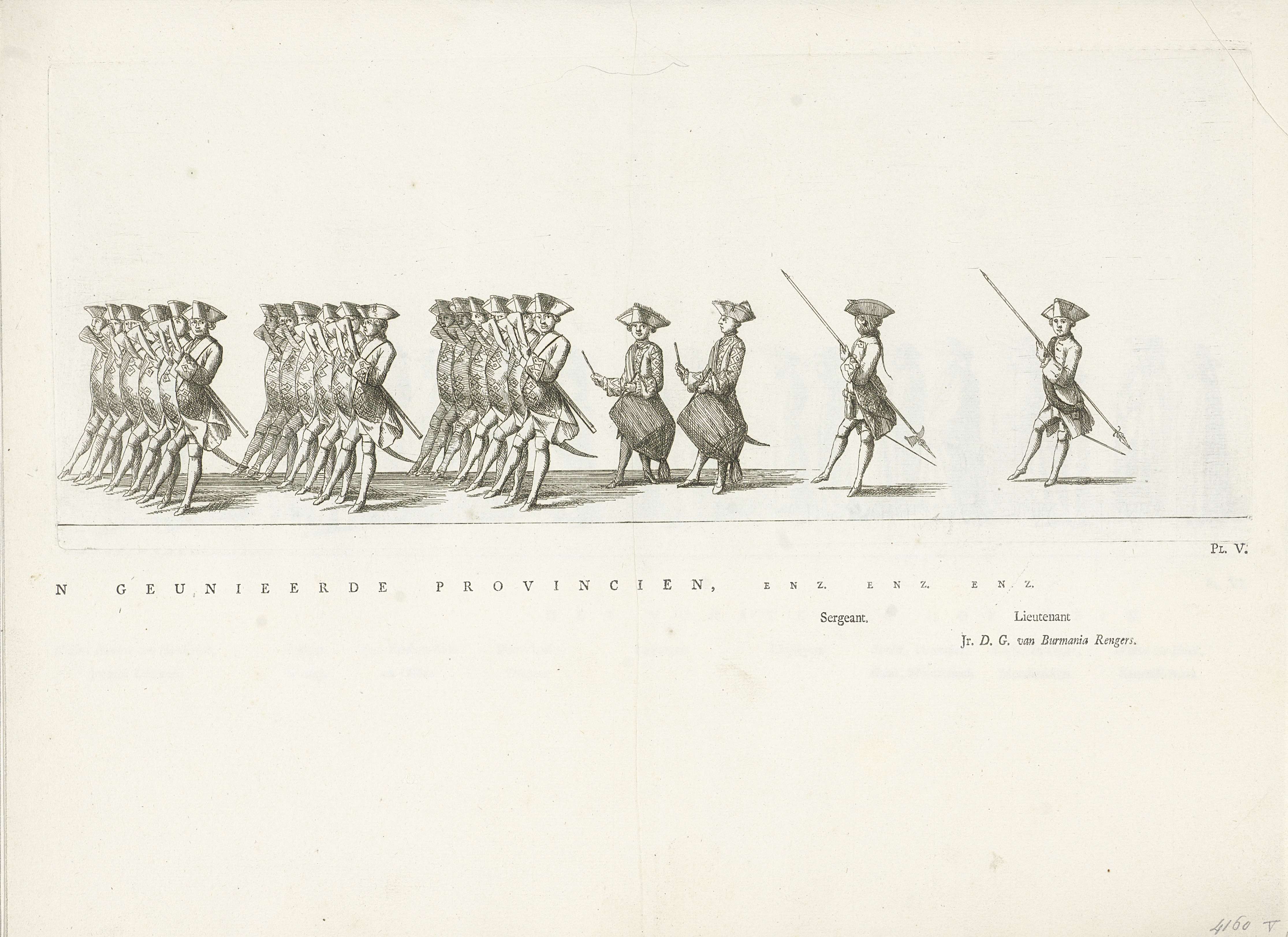 Soldaten van de Friese Garde du Corps. Gemerkt rechtsonder: Pl. V. Op het blad onder de plaat een deel van de titel en de vermelding van de naam van een persoon in de stoet en de sergeant. Onderdeel van de serie platen van de begrafenis van prinses Maria Louise te Leeuwarden op 13 juni 1765.