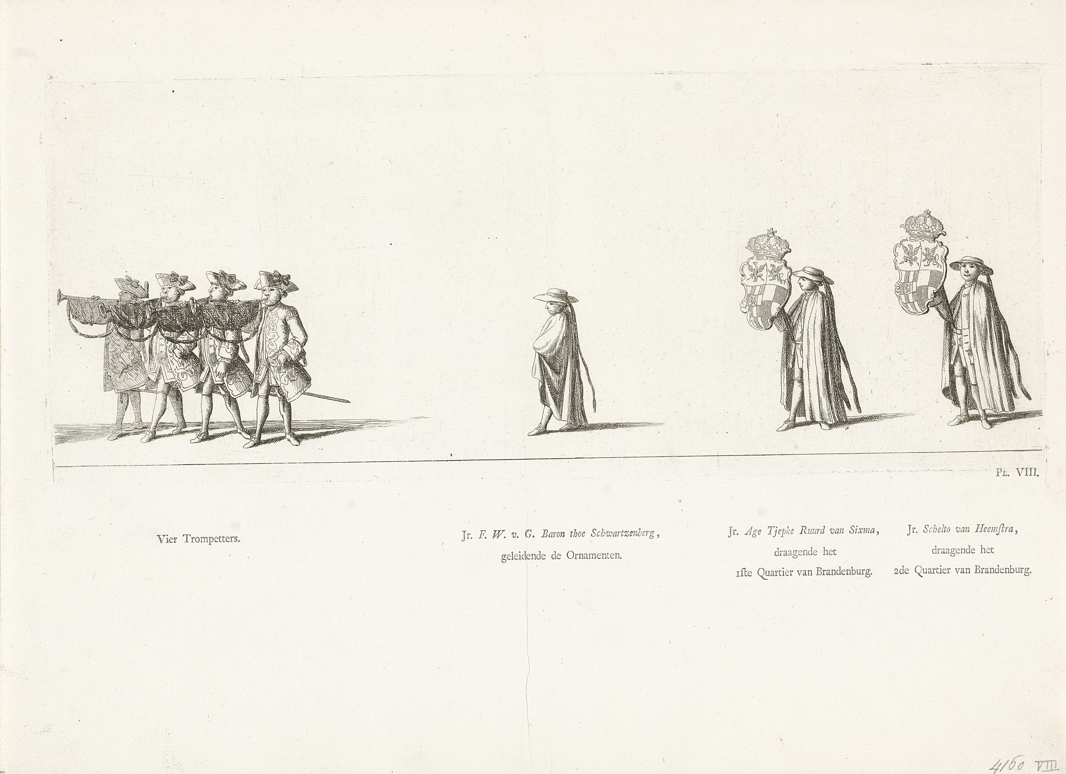 Vier trompetters gevolgd door edelen met de kwartieren van het stadhouderlijk wapen. Gemerkt rechtsonder: Pl. VIII. Op het blad onder de plaat de namen van personen in de stoet. Onderdeel van de serie platen van de begrafenis van prinses Maria Louise te Leeuwarden op 13 juni 1765.