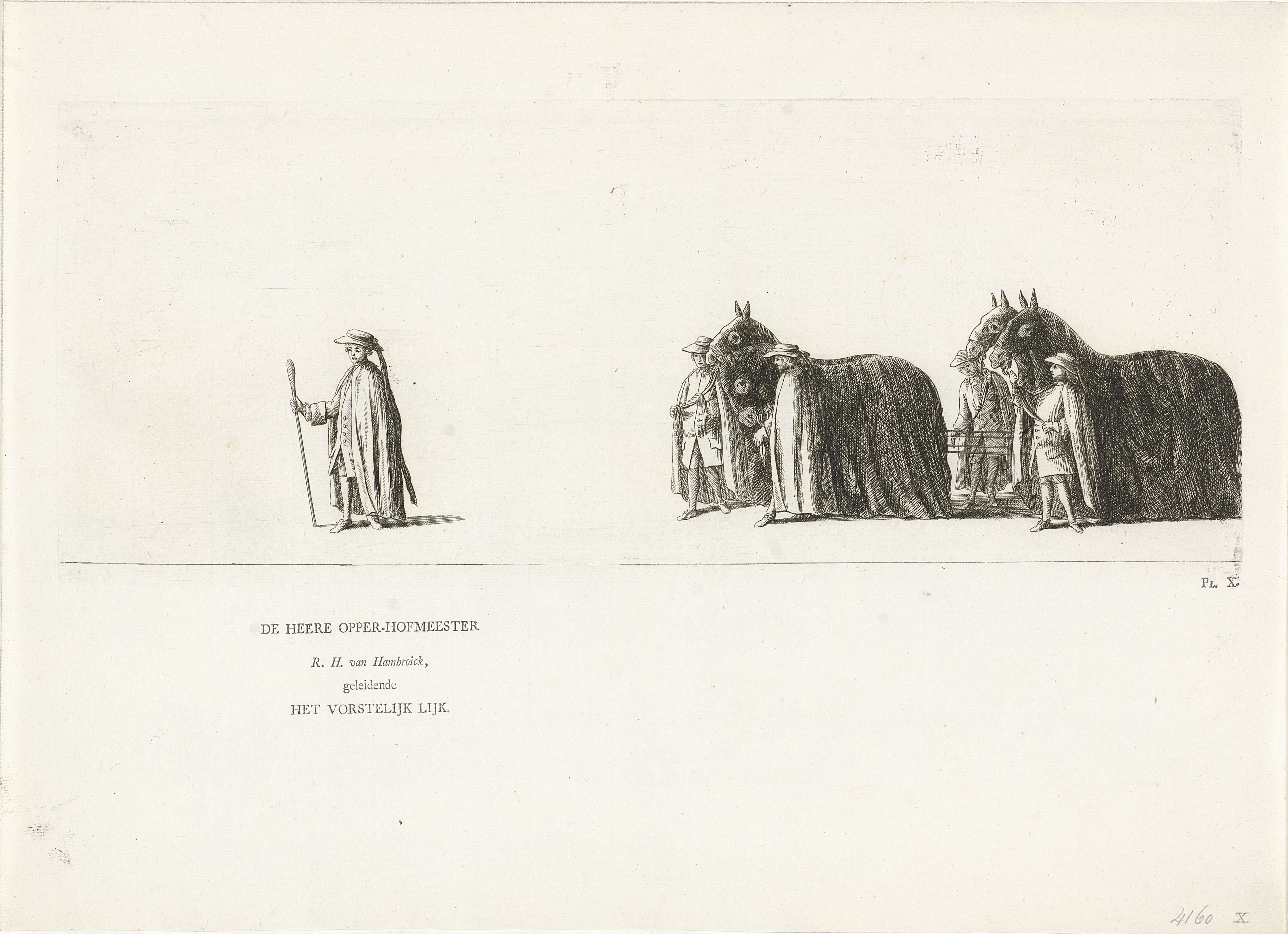 De eerste twee spannen paarden voor de lijkwagen van de prinses. Gemerkt rechtsonder: Pl. X. Op het blad onder de plaat de naam van een persoon in de stoet. Onderdeel van de serie platen van de begrafenis van prinses Maria Louise te Leeuwarden op 13 juni 1765.