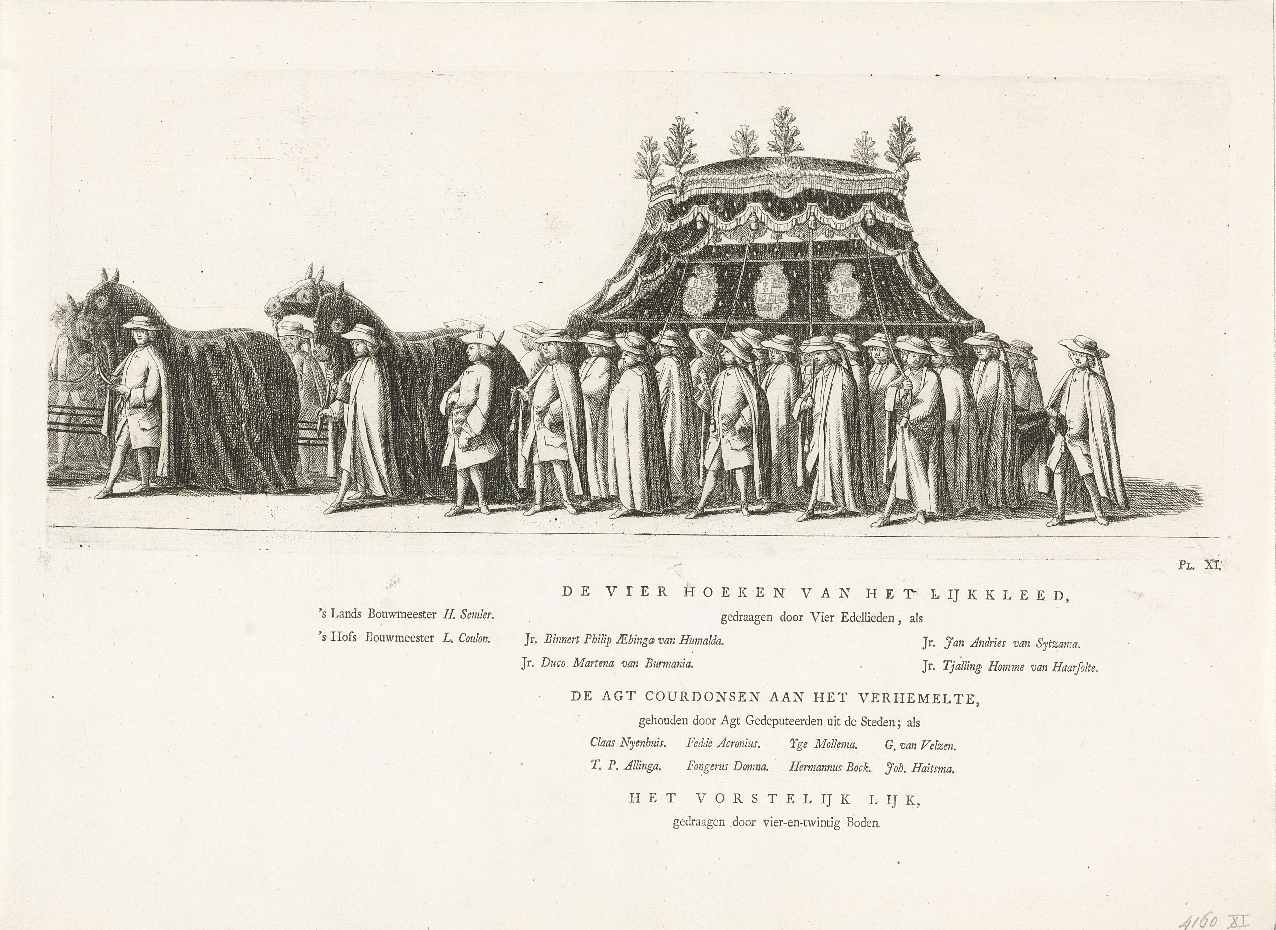 De lijkwagen met het lichaam van de prinses. Gemerkt rechtsonder: Pl. XI. Op het blad onder de plaat de namen van personen in de stoet. Onderdeel van de serie platen van de begrafenis van prinses Maria Louise te Leeuwarden op 13 juni 1765.
