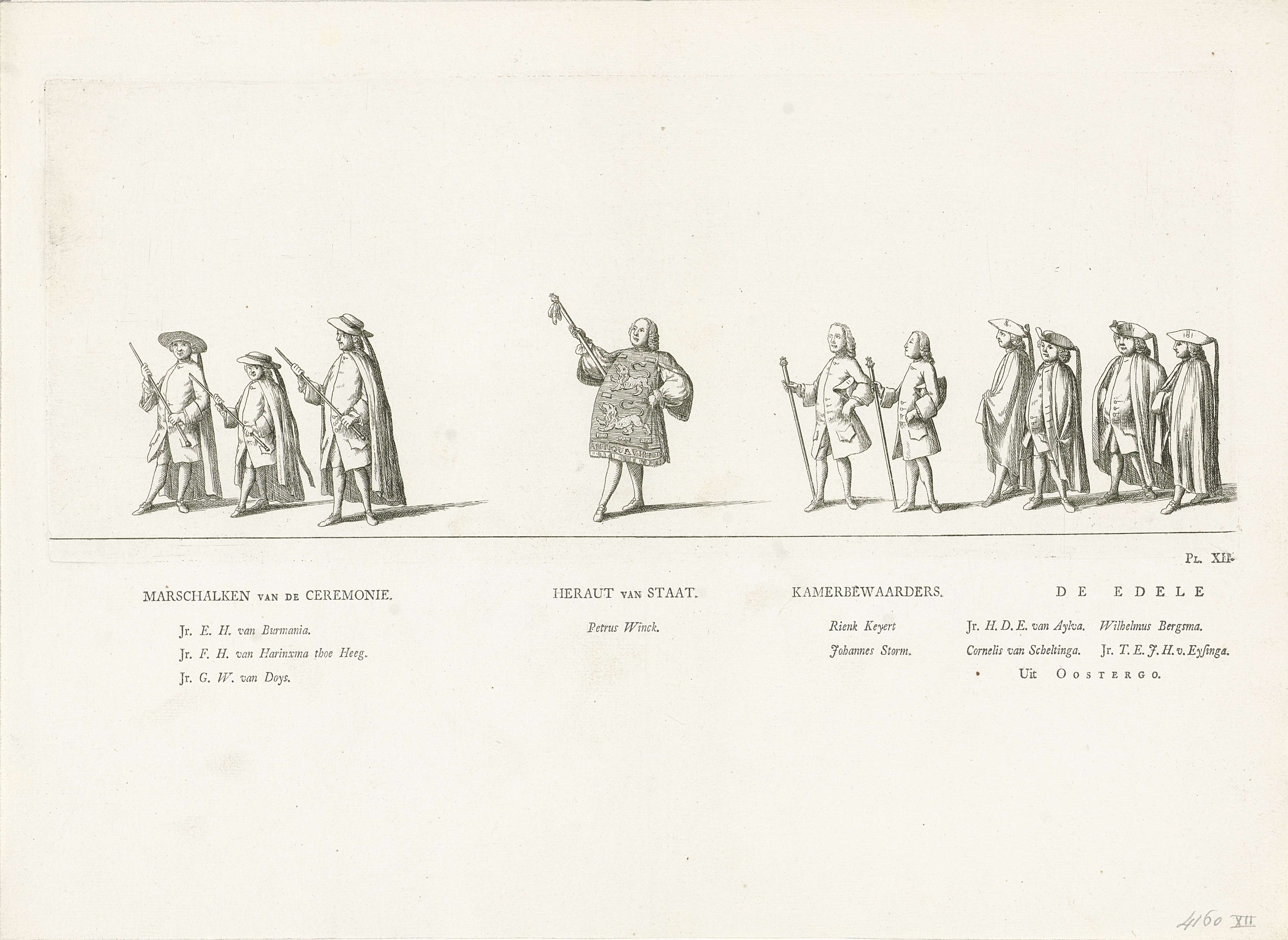 Verschillende personen. Gemerkt rechtsonder: Pl. XII. Op het blad onder de plaat de namen van personen in de stoet. Onderdeel van de serie platen van de begrafenis van prinses Maria Louise te Leeuwarden op 13 juni 1765.