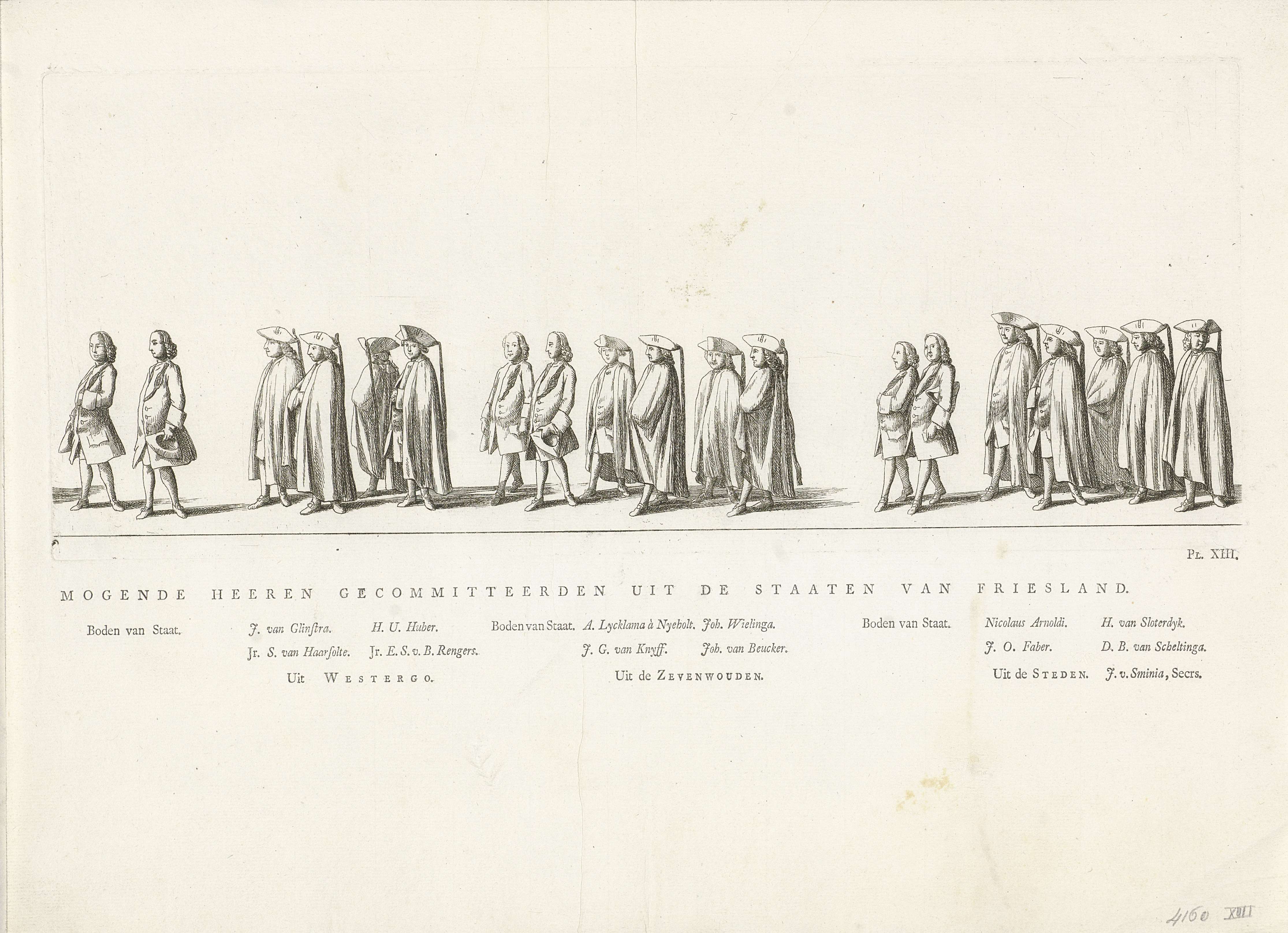 Leden van de Staten van Friesland. Gemerkt rechtsonder: Pl. XIII. Op het blad onder de plaat de namen van personen in de stoet. Onderdeel van de serie platen van de begrafenis van prinses Maria Louise te Leeuwarden op 13 juni 1765.