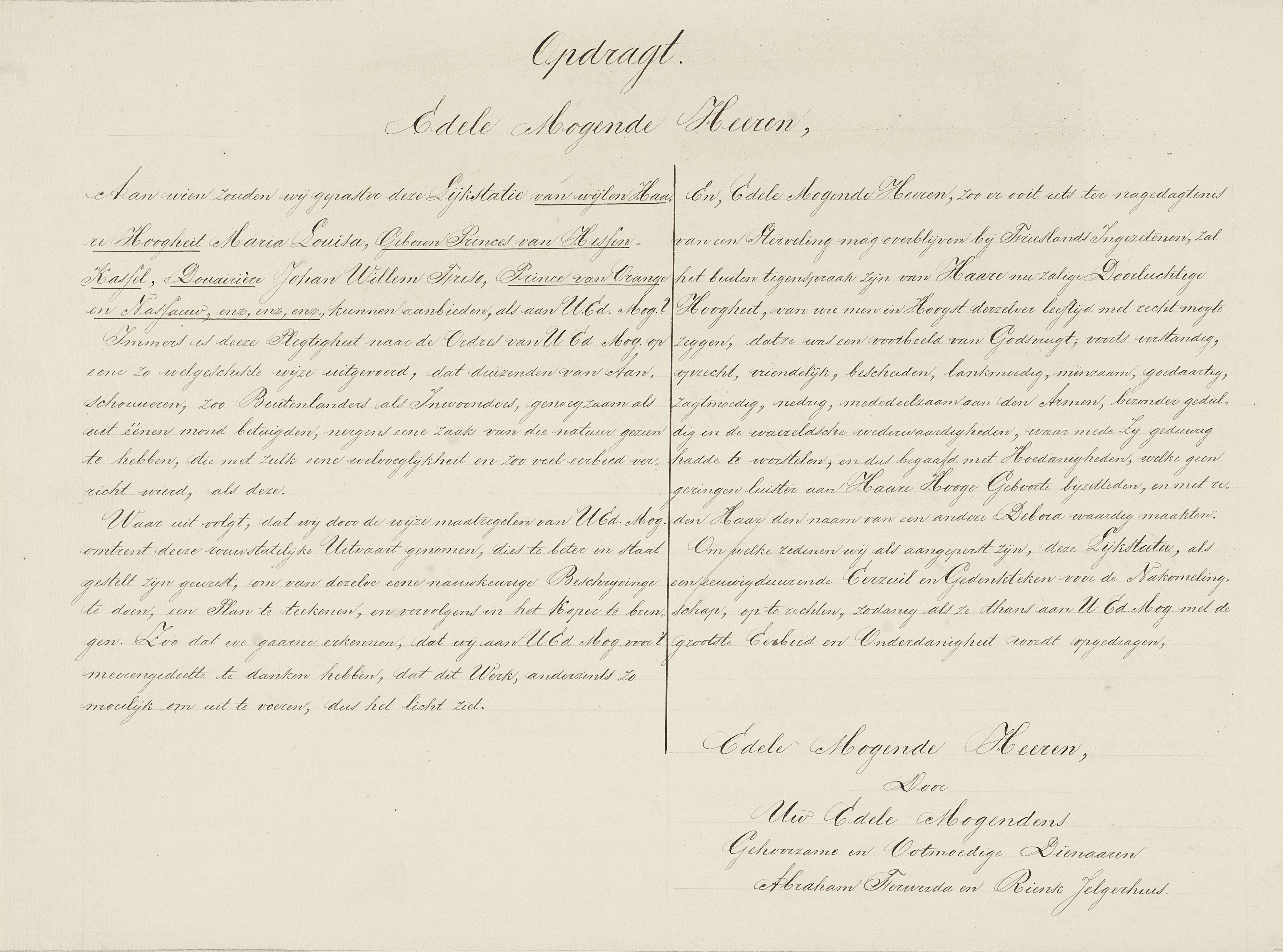 Handgeschreven blad met een deel van de opdracht aan de Gedeputeerde Staten van Friesland, behorend bij de serie platen van de begrafenis van prinses Maria Louise te Leeuwarden op 13 juni 1765. Waarschijnlijk negentiende-eeuwse afschrift naar de bij dit exemplaar ontbrekende originele gedrukte tekstbladen.