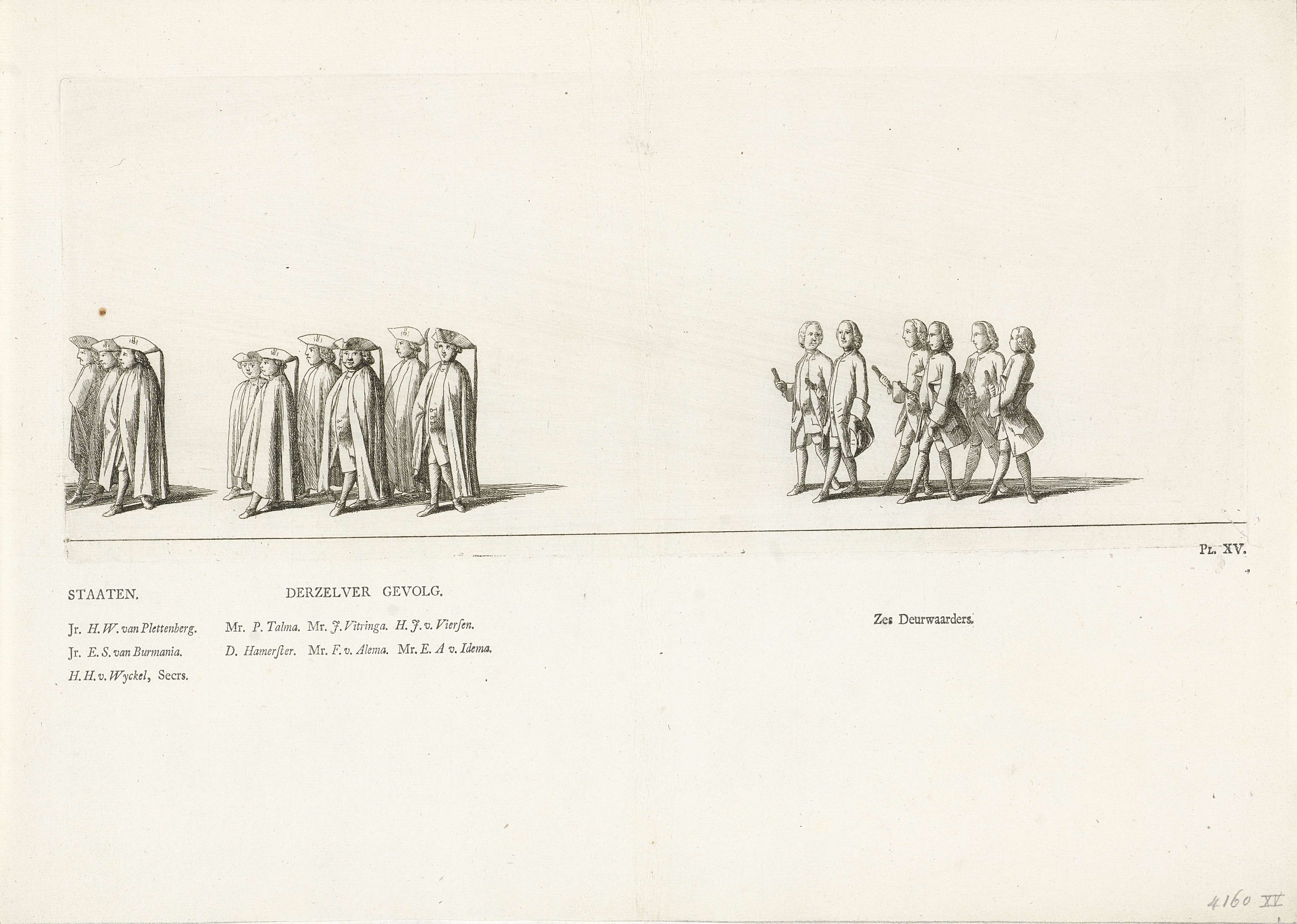 Leden van de Gedeputeerde Staten van Friesland en deurwaarders. Gemerkt rechtsonder: Pl. XV. Op het blad onder de plaat de namen van personen in de stoet. Onderdeel van de serie platen van de begrafenis van prinses Maria Louise te Leeuwarden op 13 juni 1765.