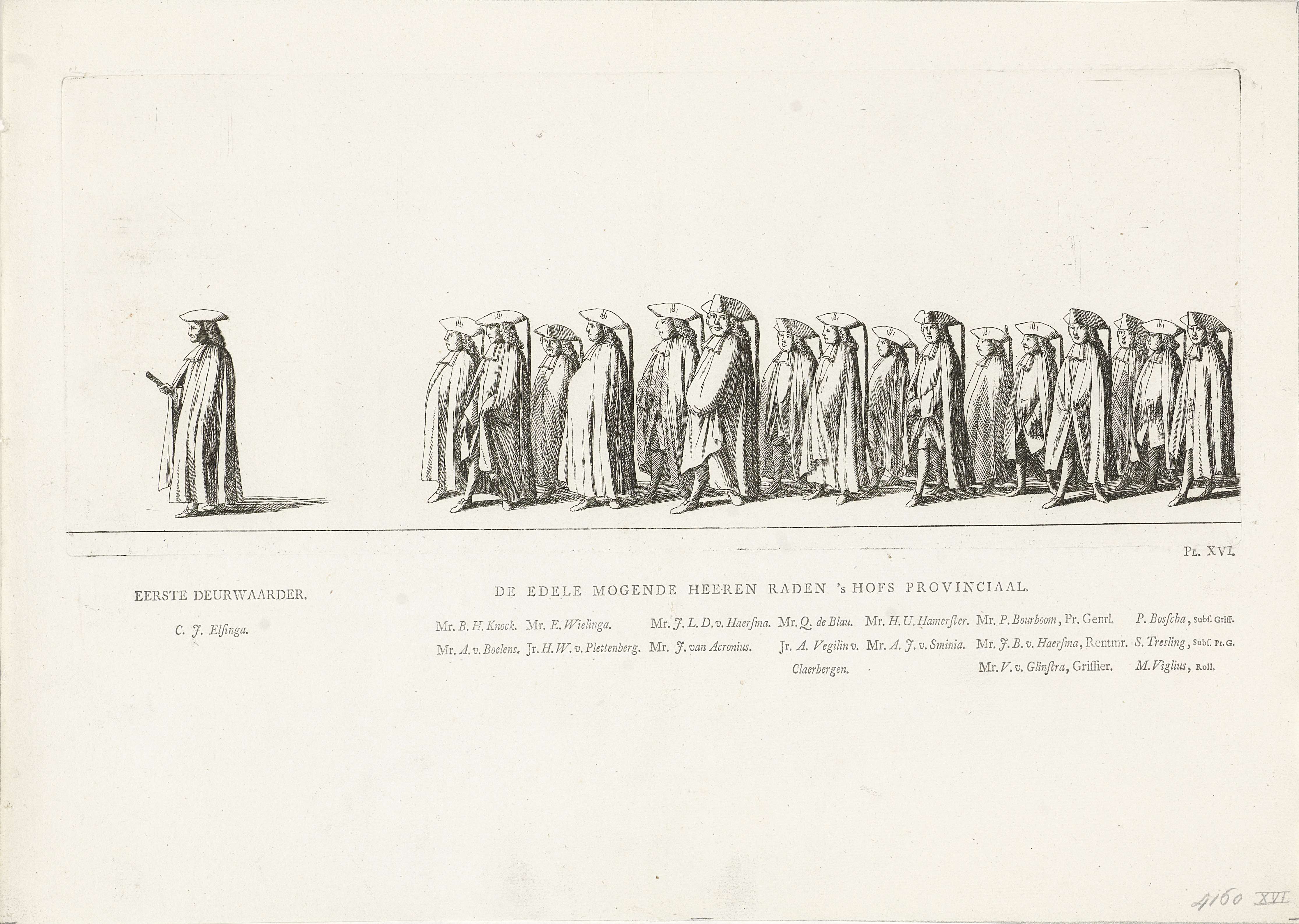 Leden van het Hof van Friesland. Gemerkt rechtsonder: Pl. XVI. Op het blad onder de plaat de namen van personen in de stoet. Onderdeel van de serie platen van de begrafenis van prinses Maria Louise te Leeuwarden op 13 juni 1765.
