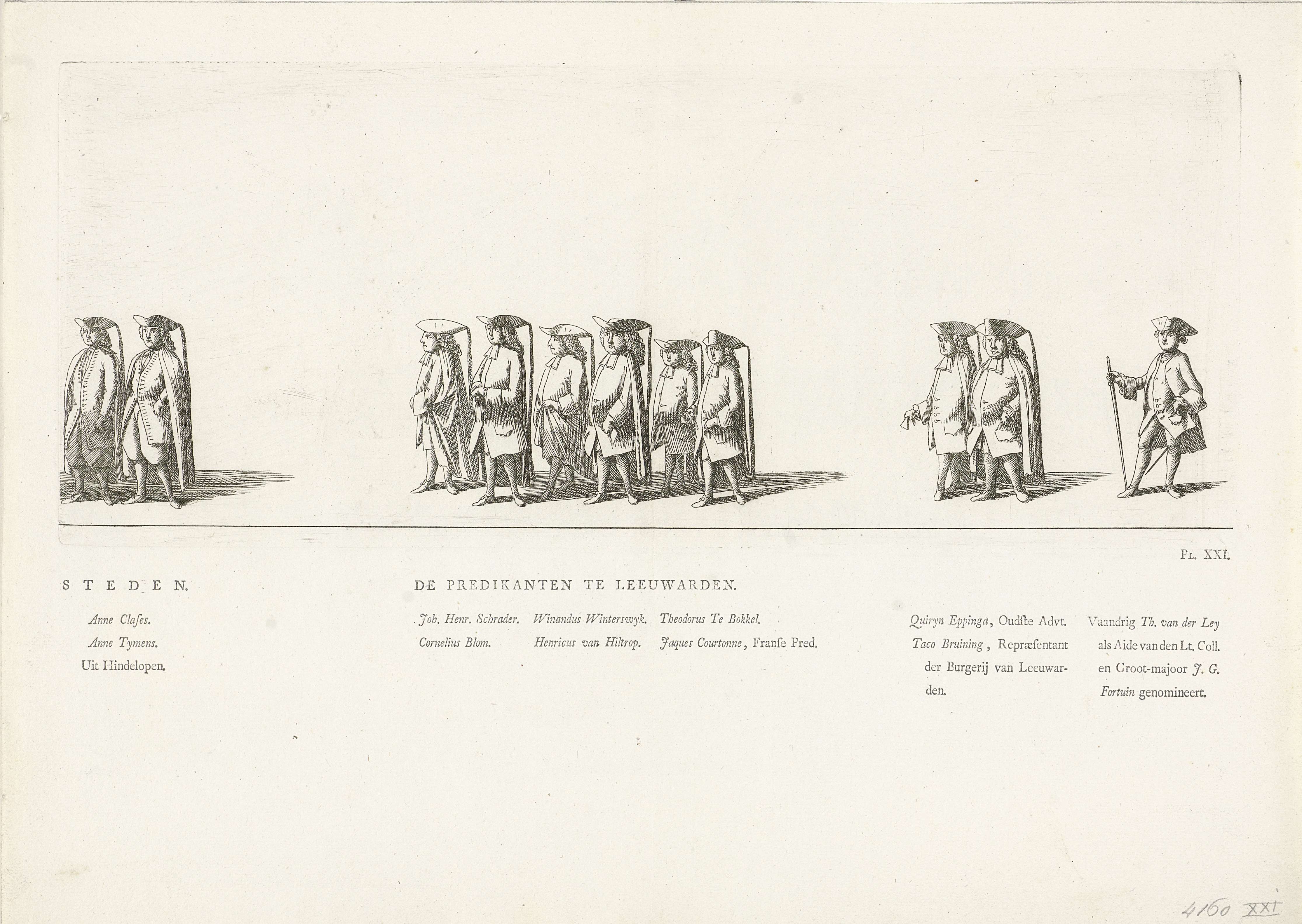 De predikanten uit Leeuwarden. Gemerkt rechtsonder: Pl. XXI. Op het blad onder de plaat de namen van personen in de stoet. Onderdeel van de serie platen van de begrafenis van prinses Maria Louise te Leeuwarden op 13 juni 1765.