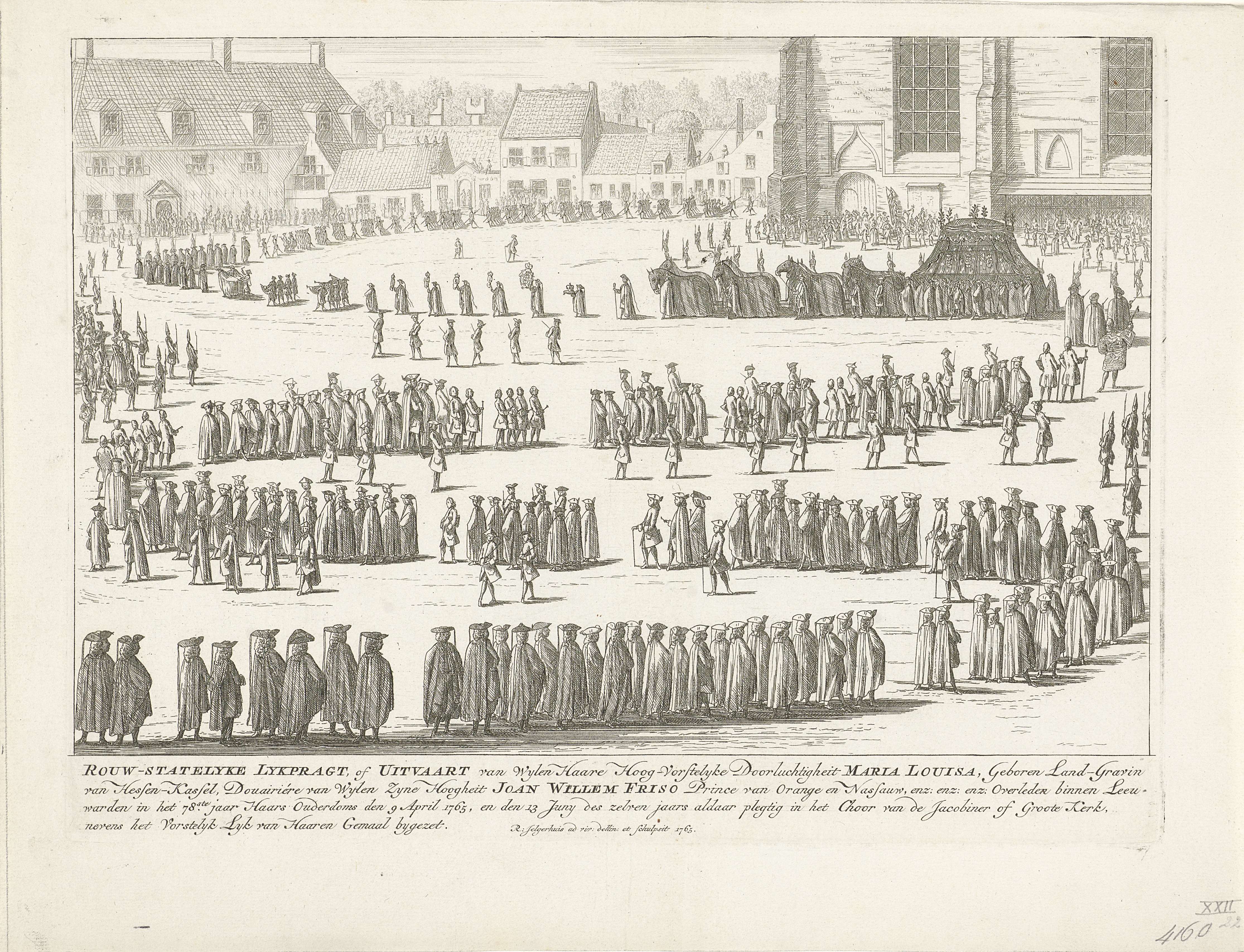 De aankomst van de begrafenisstoet van prinses Maria Louise bij de Grote Kerk te Leeuwarden. De stoet slingert zich over het plein voor de kerk. Ongenummerde prent behorend bij de serie platen van de begrafenis van prinses Maria Louise te Leeuwarden op 13 juni 1765.