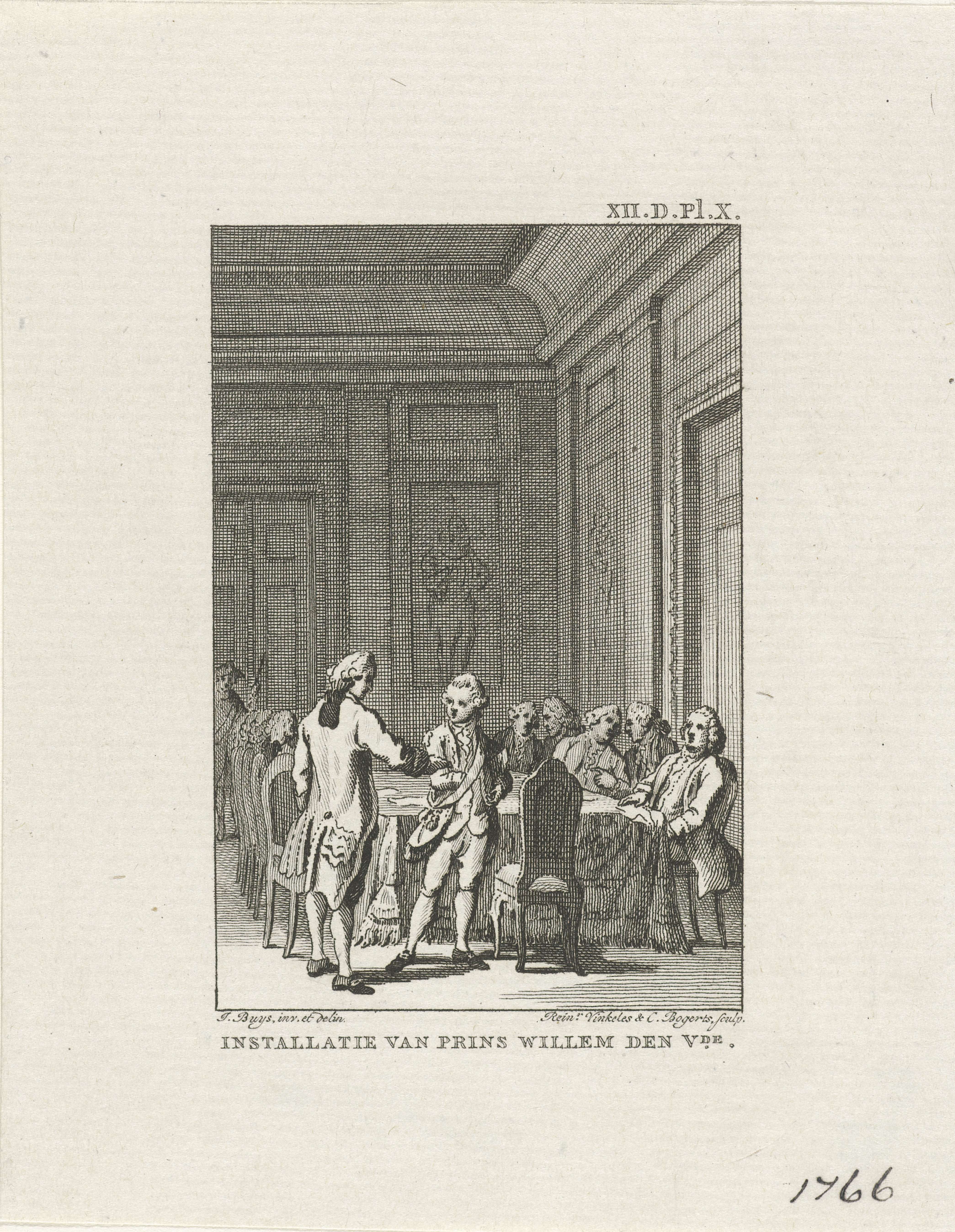 De installatie van prins Willem V als erfstadhouder in de Staten-Generaal op 8 maart 1766. De prins neemt deel aan een vergadering van de Staten-Generaal. Gemerkt rechtsboven: XII. D. Pl. X.