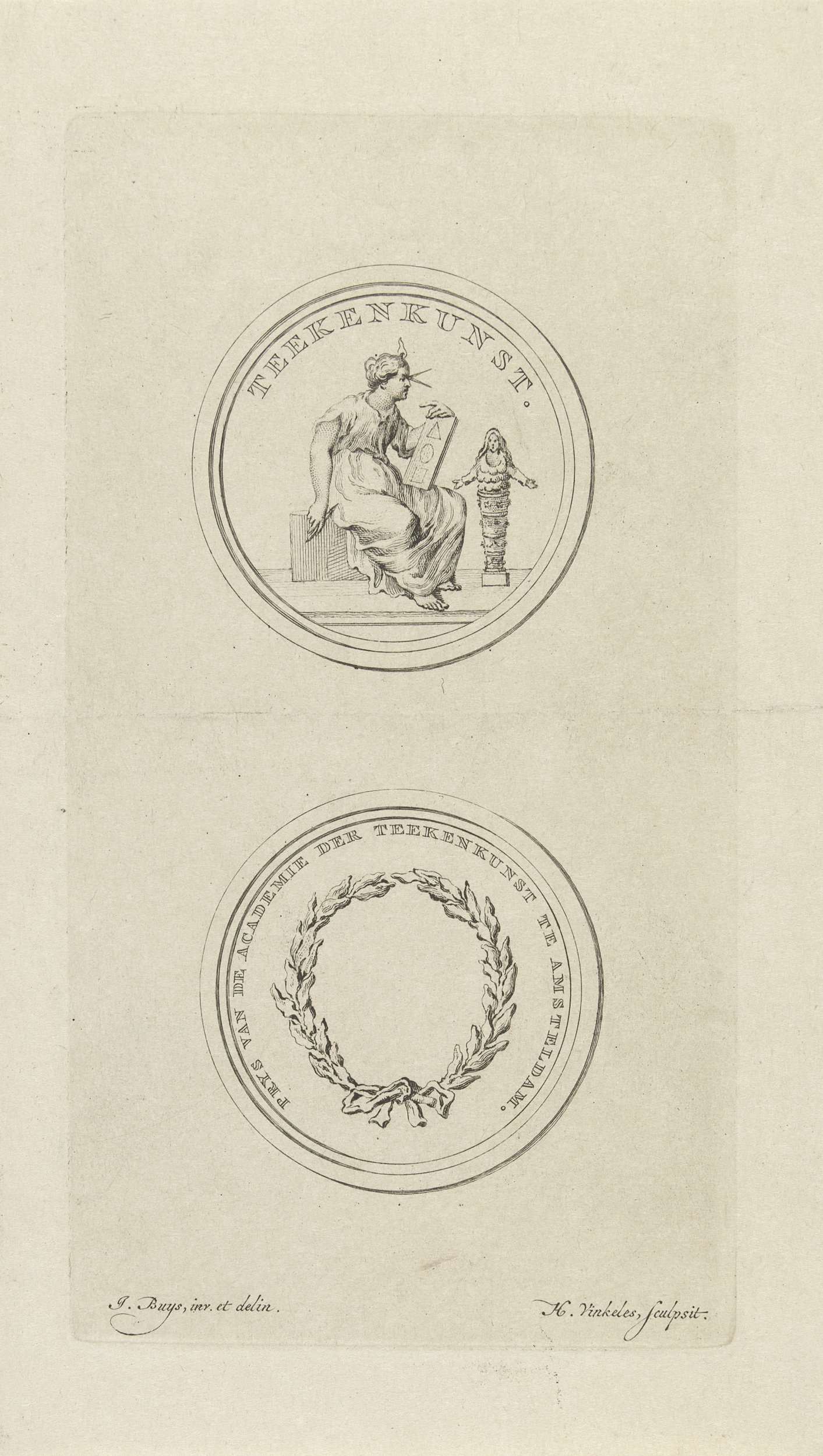 Prijspenning uitgereikt door de stadstekenacademie (Teeken-Academie) te Amsterdam, ca. 1765-1780. Op de voorzijde de Tekenkunst, afgebeeld als vrouw met vlam op hoofd, zit met pen en tekenbord in handen op steen tegenover een Egyptisch beeld, dat zij met passer in haar oog opmeet. Keerzijde: lauwerkrans en omschrift.