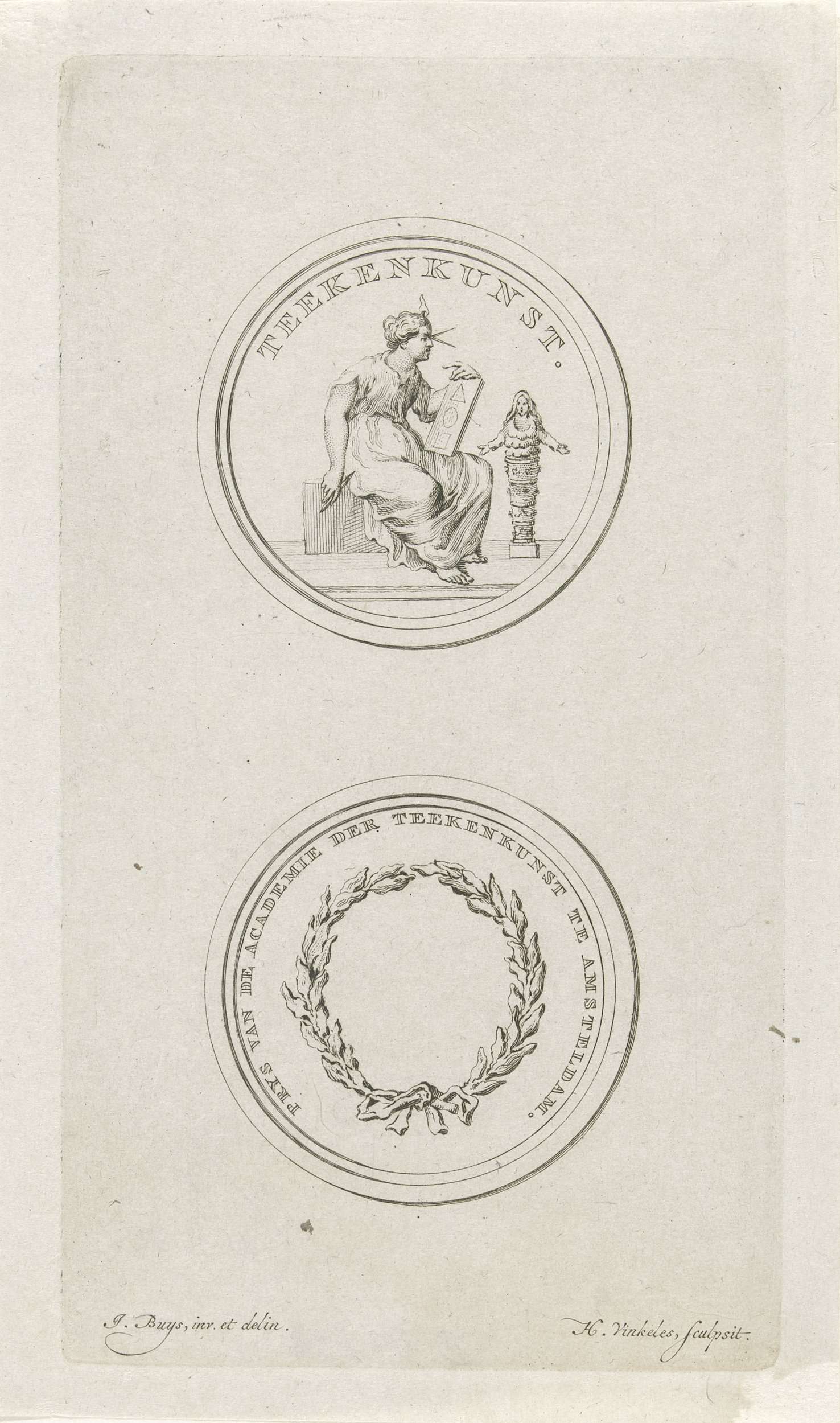 Prijspenning uitgereikt door de stadstekenacademie (Teeken-Academie) te Amsterdam, ca. 1765-1780. Op de voorzijde de Tekenkunst, afgebeeld als vrouw met vlam op hoofd, zit met pen en tekenbord in handen op steen tegenover een Egyptisch beeld, dat zij met passer in haar oog opmeet. Keerzijde: lauwerkrans en omschrift.