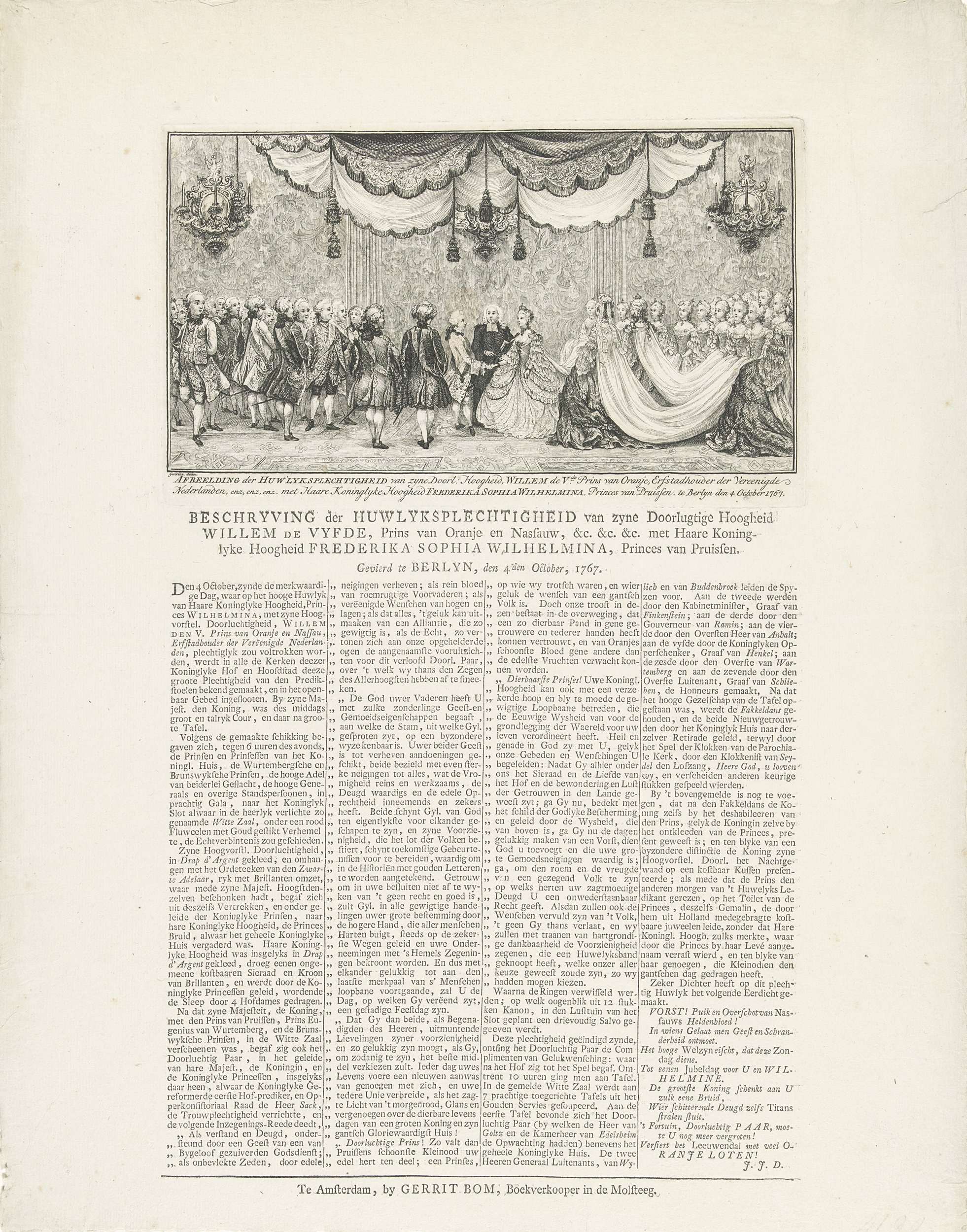 Huwelijk van stadhouder Willem V en prinses Wilhelmina van Pruisen te Berlijn op 4 oktober 1767. Voorstelling van de huwelijksceremonie met op het blad onder de plaat een beschrijving van de gebeurtenissen in vier kolommen.