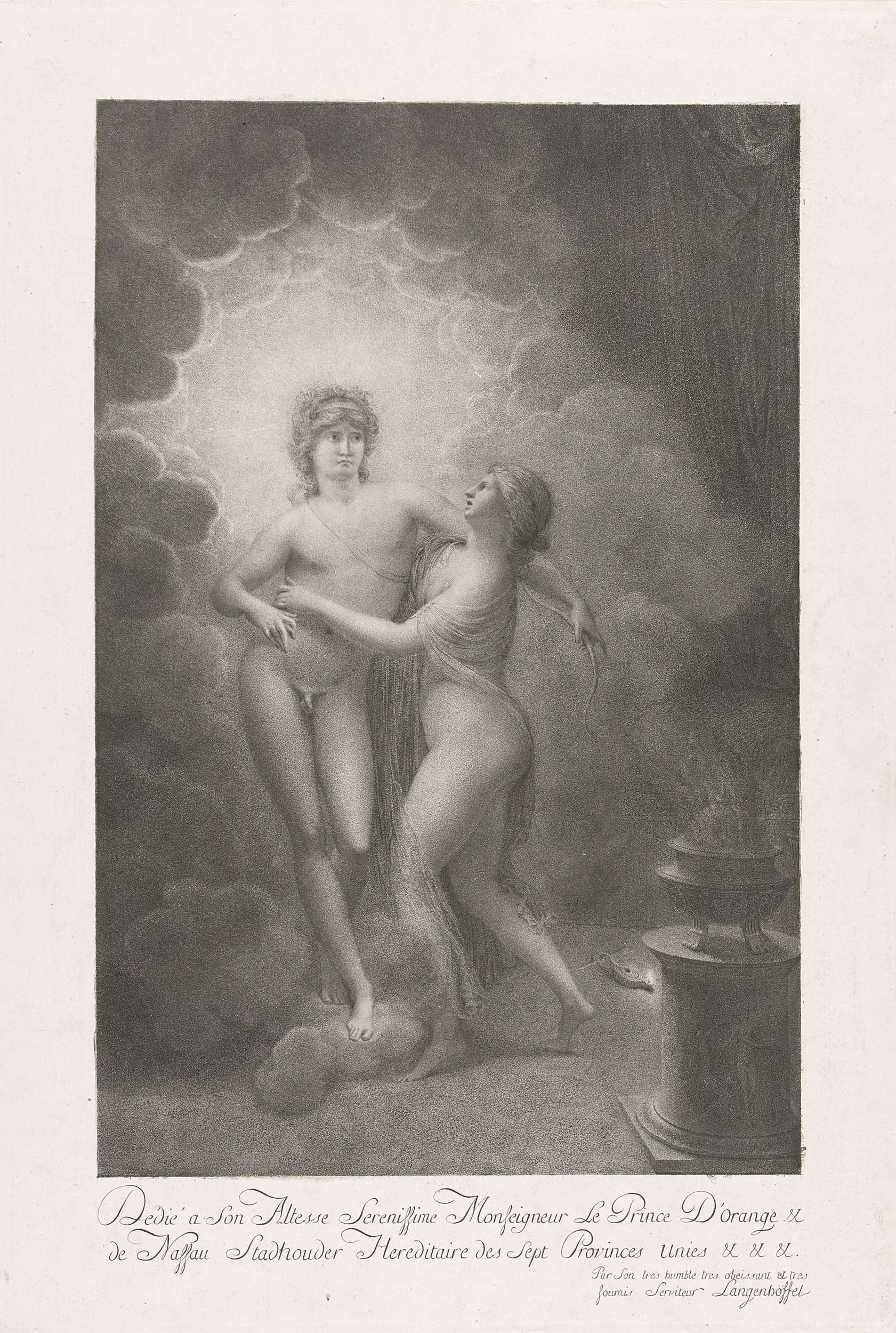 Allegorie op het huwelijk van stadhouder Willem V en prinses Wilhelmina van Pruisen op 4 oktober 1767. Twee naakte geïdealiseerde figuren van de prins en prinses omgeven door wolken, rechts een altaar. De prins als de zonnegod Apollo staande op een wolk. In de marge de opdracht aan het huwelijkspaar in het Frans.