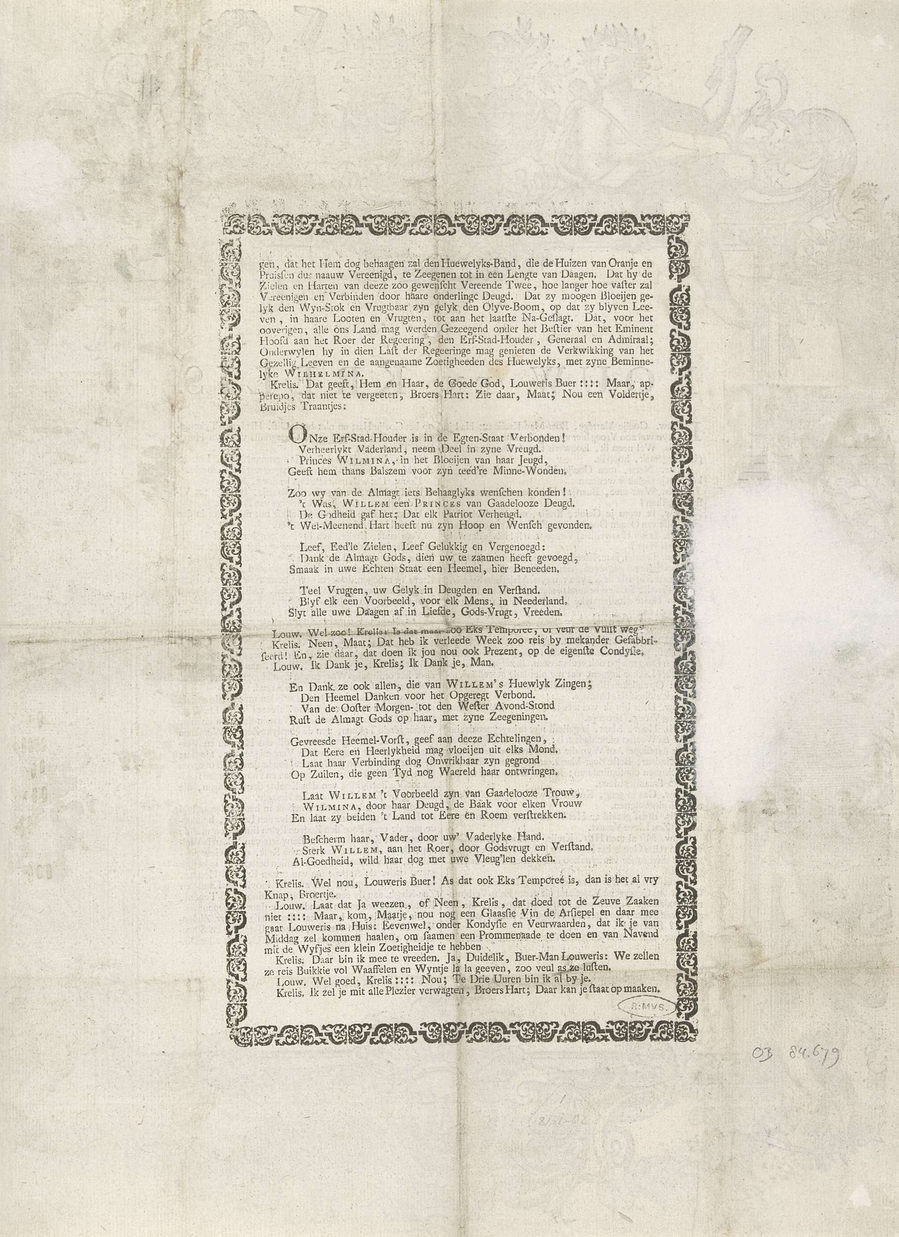 Vervolg van de samenspraak van Louw en Krelis, ter gelegenheid van het huwelijk van stadhouder Willem V en prinses Wilhelmina van Pruisen op 4 oktober 1767. Tekst in boekdruk in een kolom in versvorm, binnen een eenvoudige rand van fileten. Vervolg van de tekst op de voorzijde.