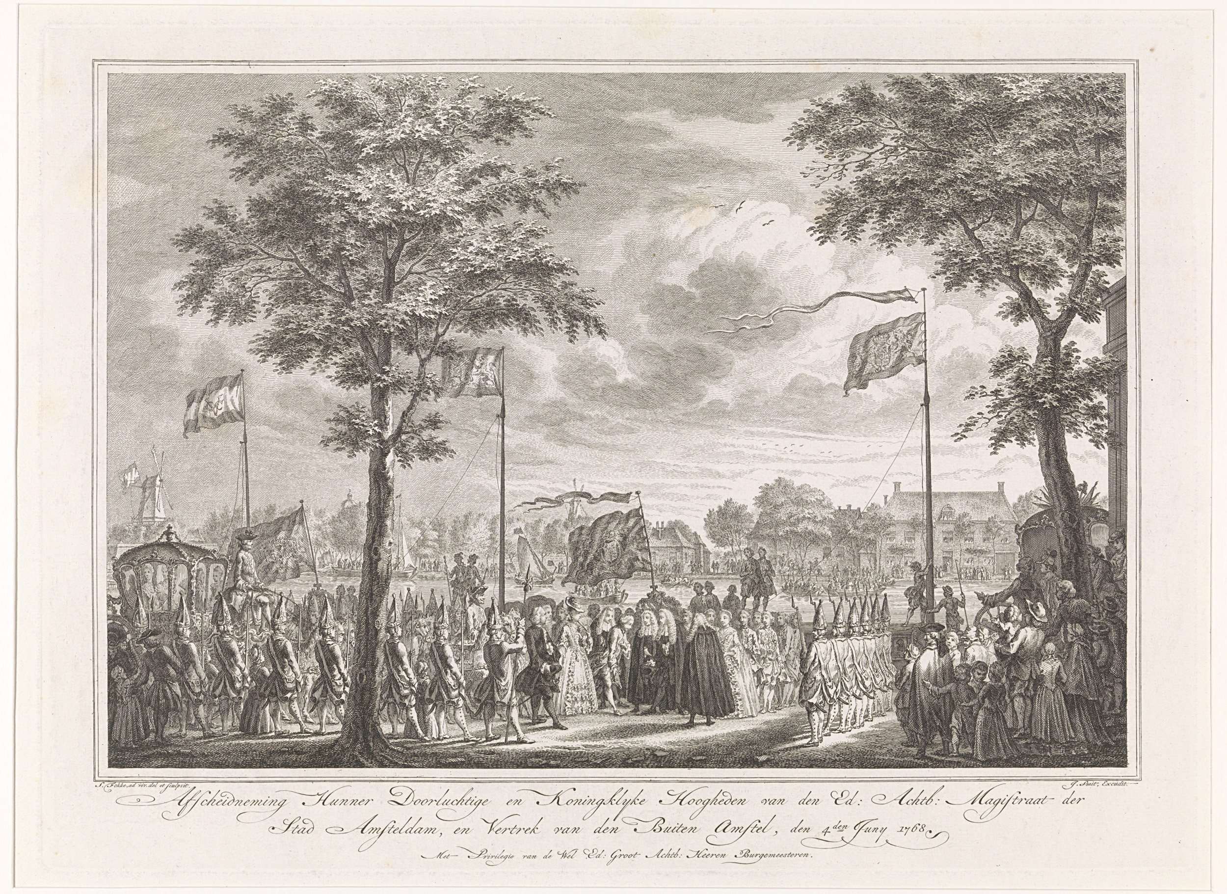 De stadhouder Willem V en prinses Wilhelmina van Pruisen nemen afscheid van het magistraat van Amsterdam bij de herberg De Berebijt aan de Buitenamstel, 4 juni 1768. Onderdeel van een prentserie met titelprent en 14 platen van de inhaling van de prins en prinses te Amsterdam, 30 mei - 4 juni 1768.
