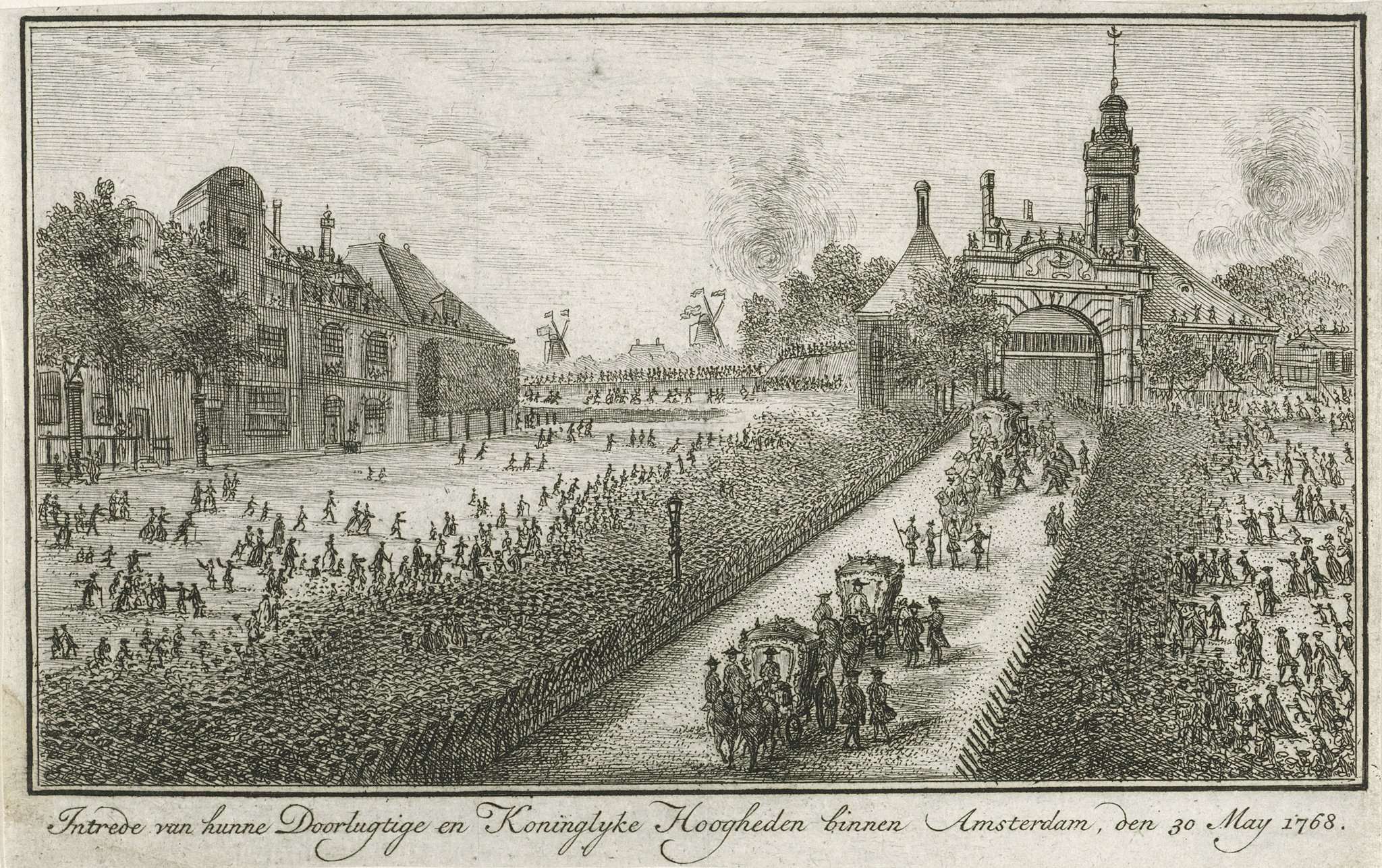 Aankomst van Willem V en Wilhelmina van Pruisen bij de Haarlemmerpoort, 1768