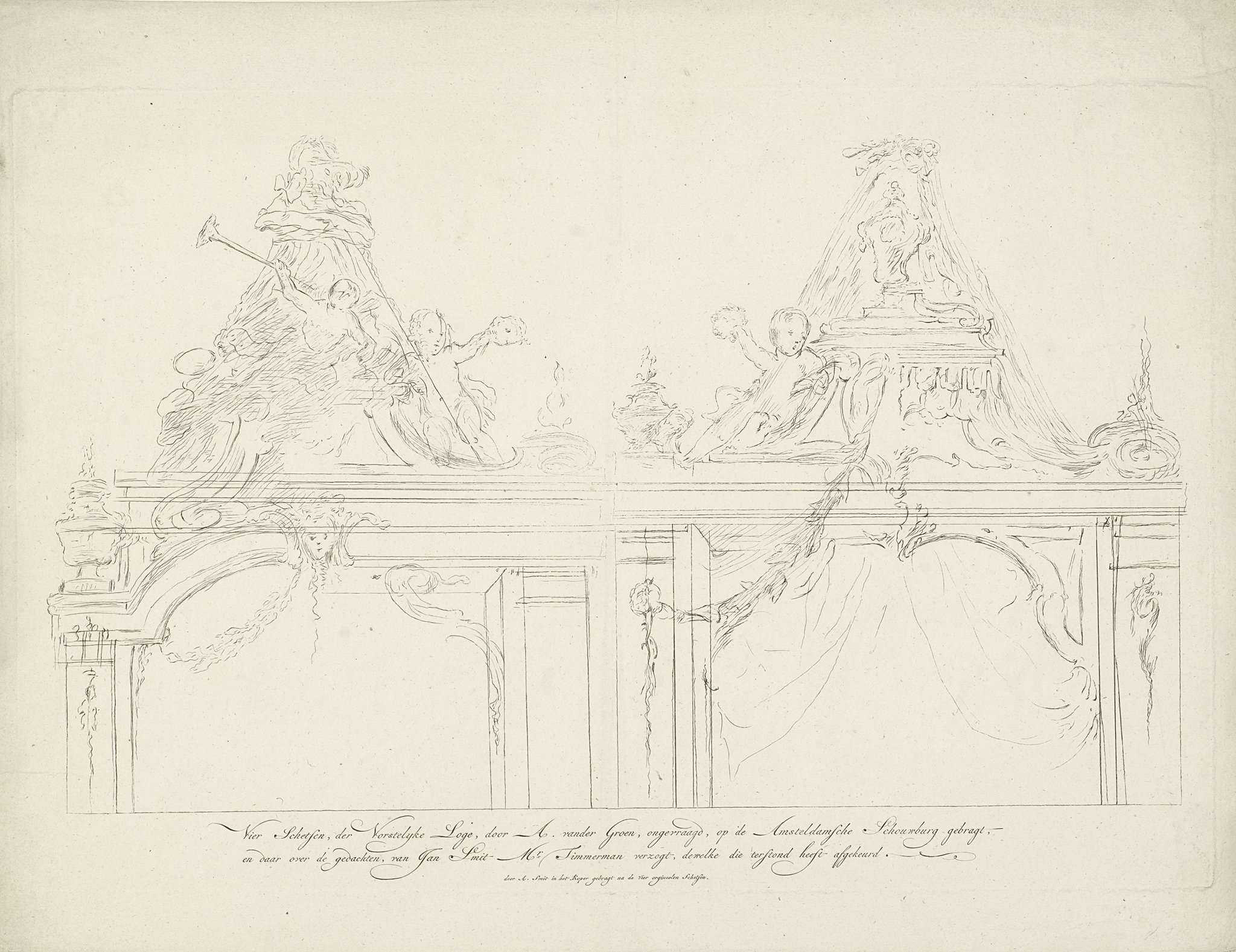 De vier schetsen van Andries van der Groen voor de vorstelijke loge in de Amsterdamse Schouwburg bij het bezoek van Willem V en Wilhelmina van Pruisen te Amsterdam, 31 mei - 4 juni 1768. De door de timmerman Jan Smit afgekeurde vier schetsen in één voorstelling in beeld gebracht.
