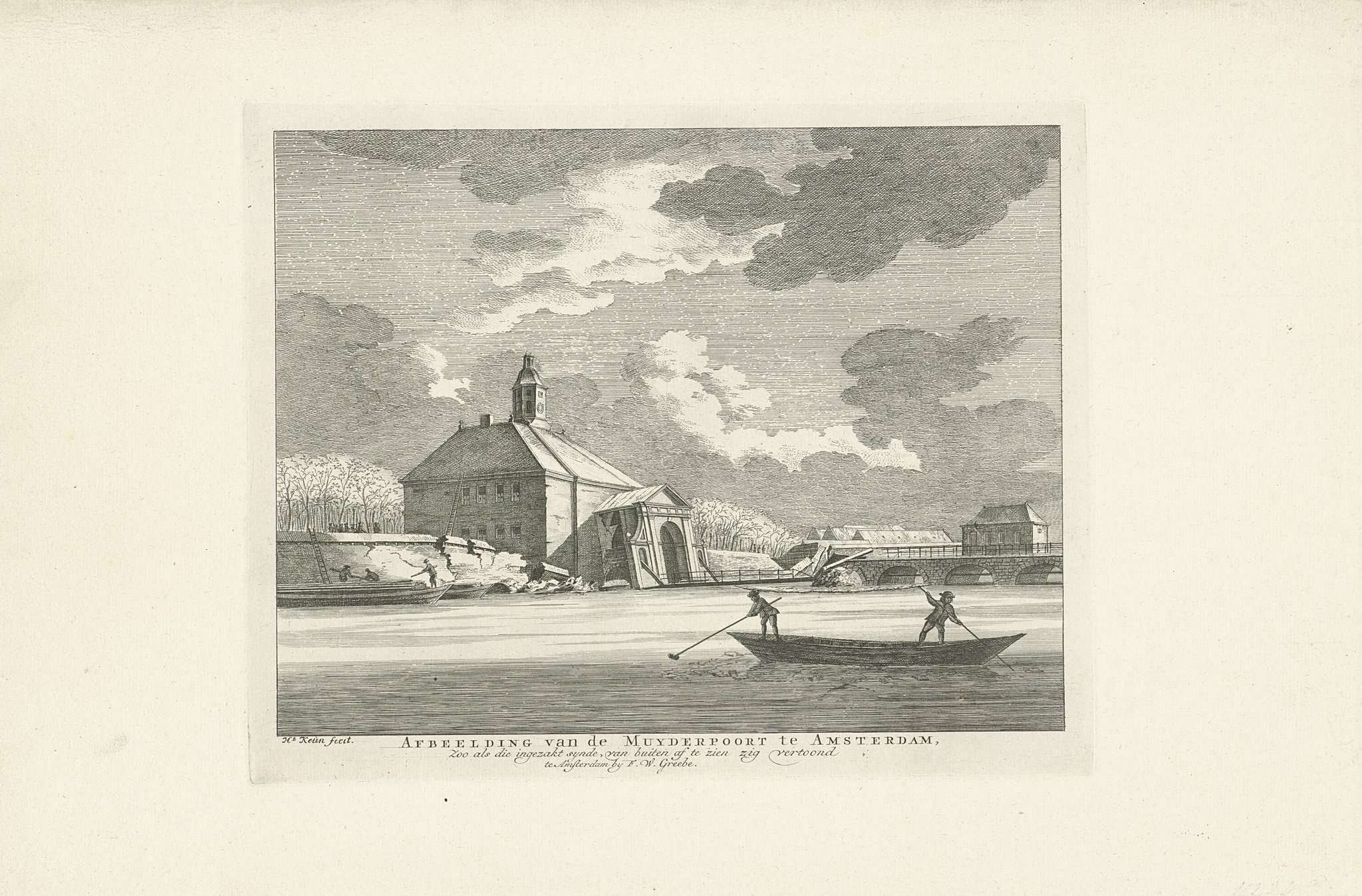 De verzakte Muiderpoort te Amsterdam, gezien vanaf de Singelgracht, 30 januari 1769. Op de voorgrond een schuit met twee mannen.