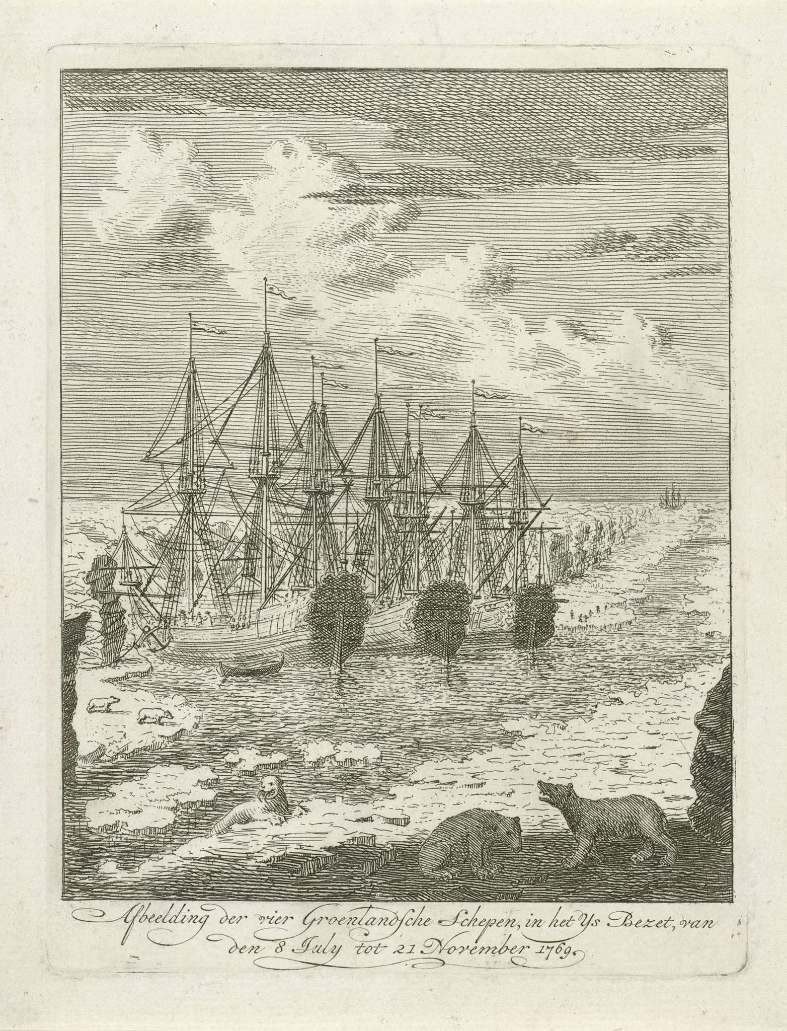 De vier schepen onder bevel van Jakob Jansen onderweg van Hamburg naar Groenland, vast in het ijs van 8 juli tot 21 november 1769. Op de voorgrond twee ijsberen.
