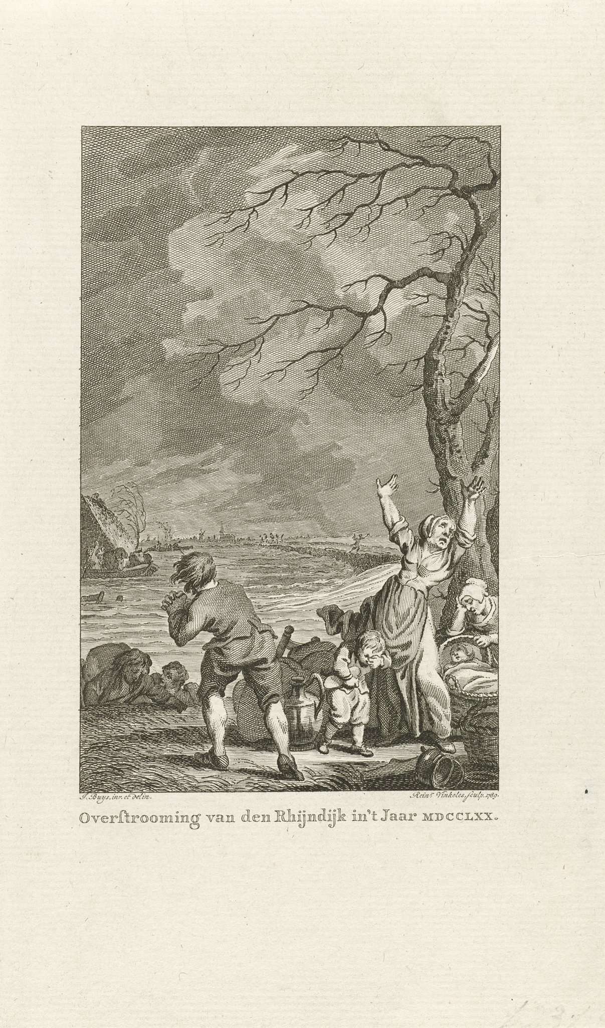 Watersnood door overstroming van de Rijndijk in Gelderland, januari 1770. Op de voorgrond een wanhopig gezin met huisraad.