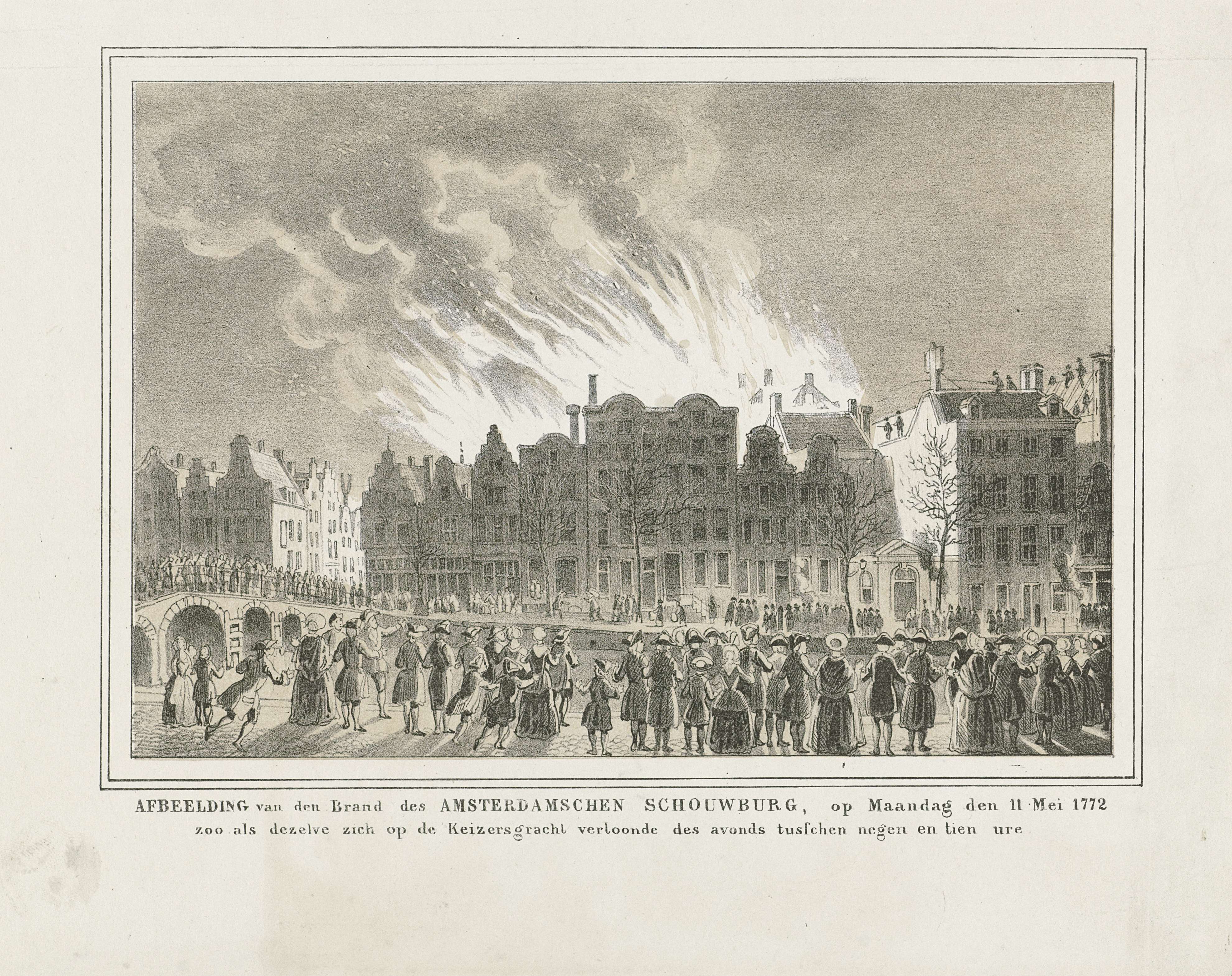 Brand van de schouwburg aan de Keizersgracht te Amsterdam gezien vanaf de overzijde, 1772