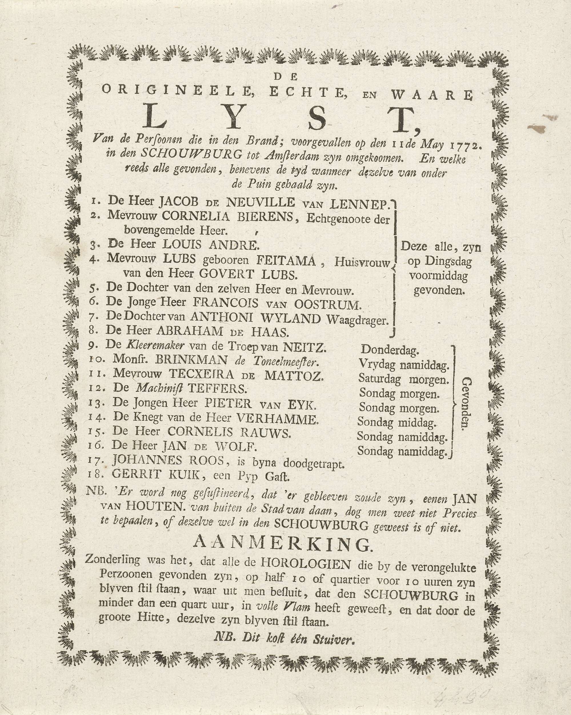 Tekstblad met een lijst van de namen van de 18 slachtoffers die omkwamen bij de brand in de Amsterdamse Schouwburg op de Keizersgracht op 11 mei 1772. Onderaan de prijs van het blad: één stuiver.