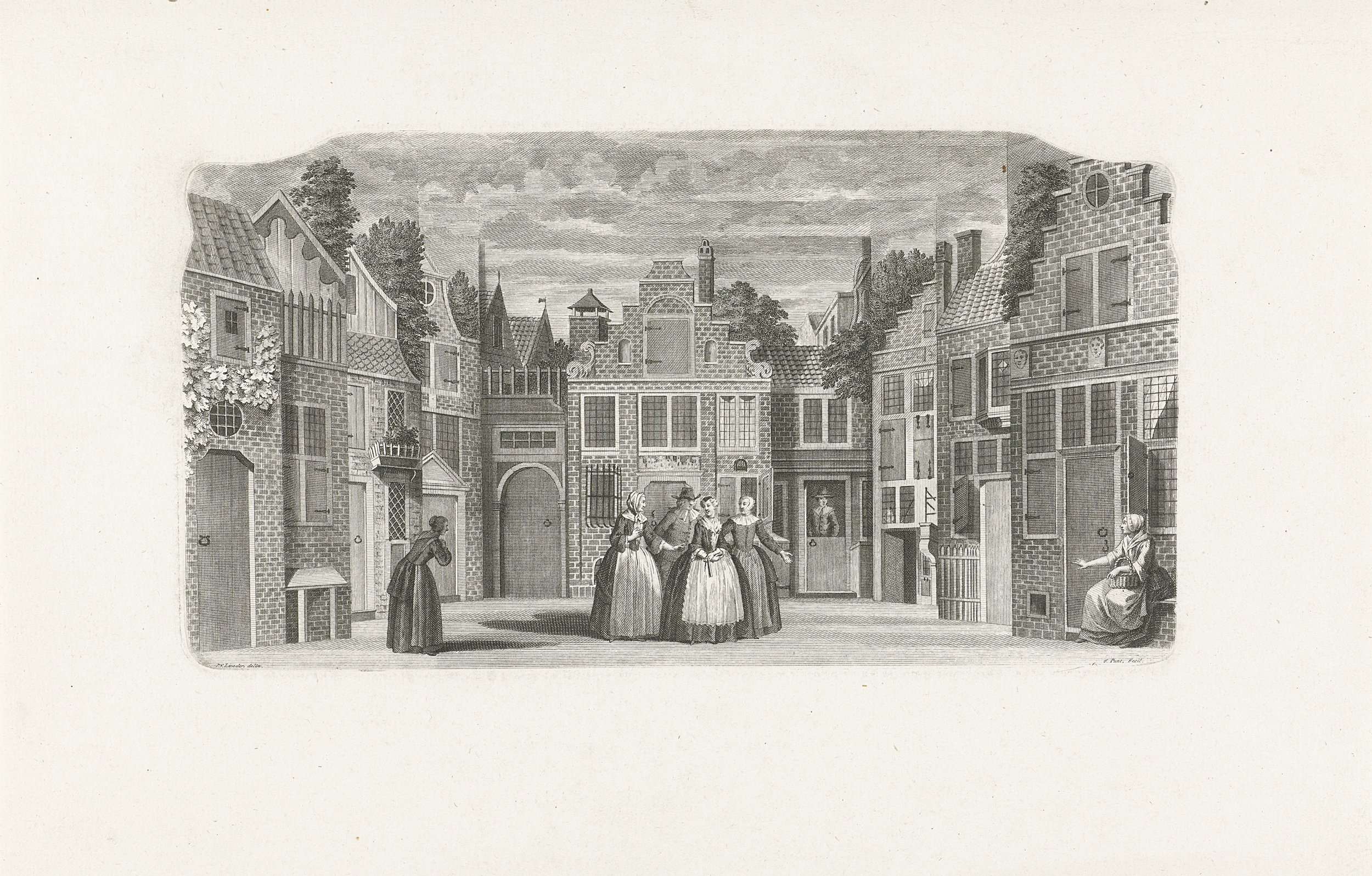 Het coulissendecor De Gemeene Buurt met scène uit: Het Verliefde Brechje. Alleen het decor gedrukt van een aparte plaat, dus zonder het passe-partout. Onderdeel van een serie van 12 toneeldecors van de Amsterdamse Schouwburg op de Keizersgracht.