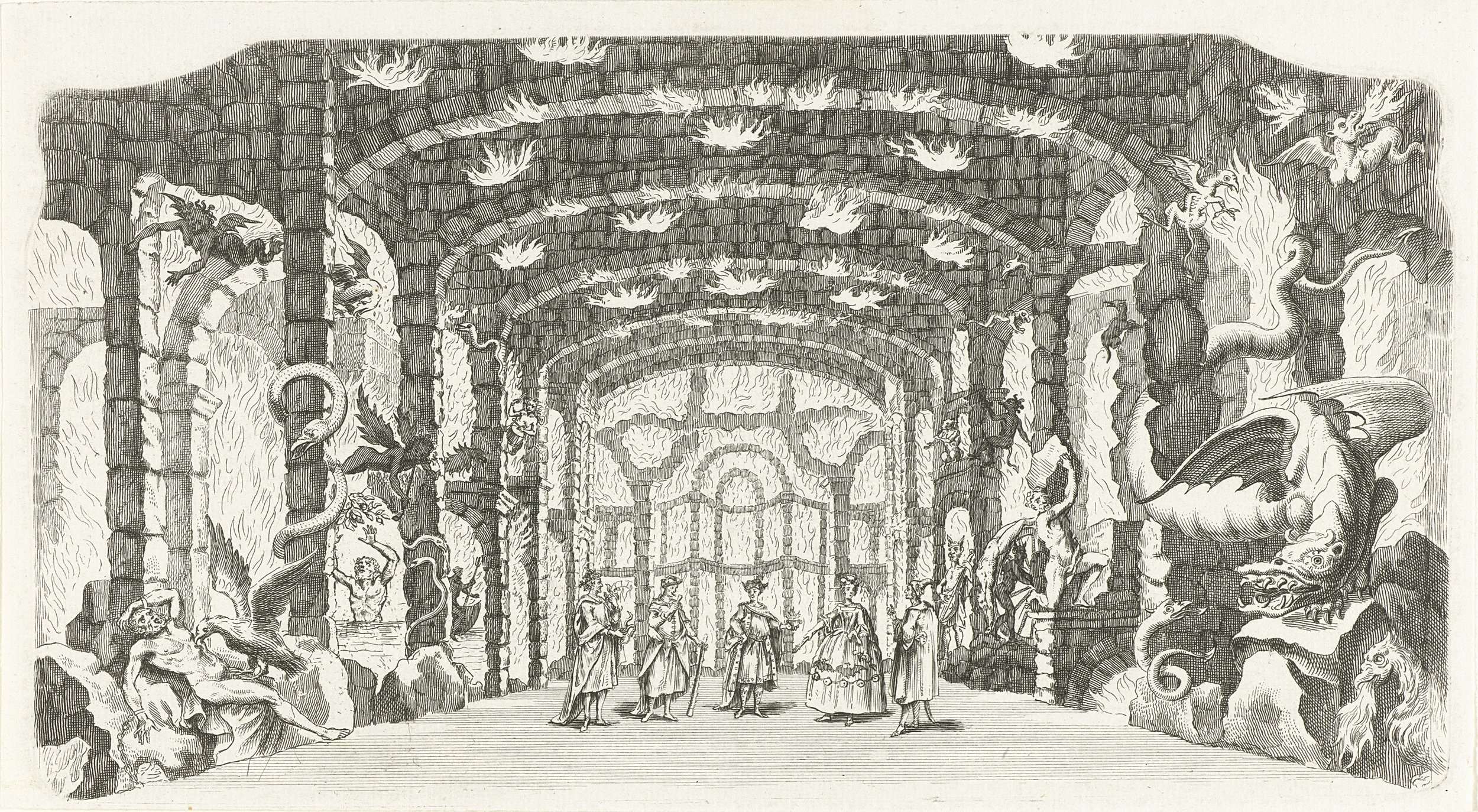 Het coulissendecor De Hel met scène uit: Het Eeuwgetijde van den Amsteldamschen Schouwburg. Alleen het decor gedrukt van een aparte plaat, dus zonder het passe-partout. Onderdeel van een serie van 12 toneeldecors van de Amsterdamse Schouwburg op de Keizersgracht.