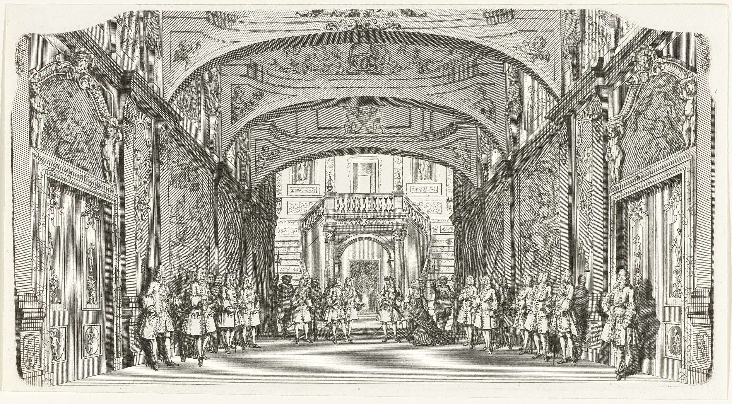 Het coulissendecor Het nieuwe Hofportaal met scène uit: Karel de Stoute, hartog van Bourgondie. Alleen het decor gedrukt van een aparte plaat, dus zonder het passe-partout. Onderdeel van een serie van 12 toneeldecors van de Amsterdamse Schouwburg op de Keizersgracht.