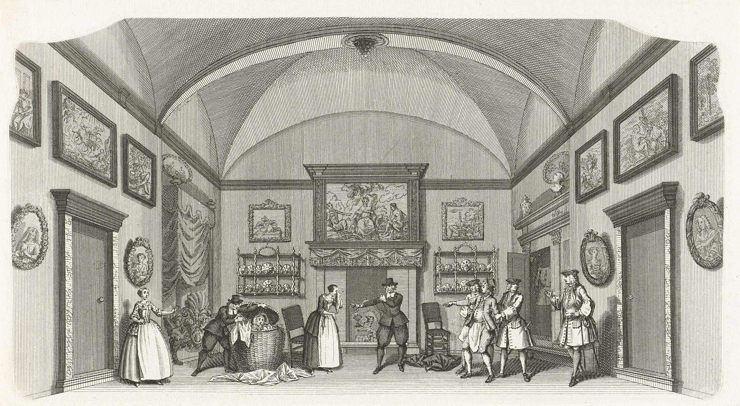 Het coulissendecor De Gestoffeerde Kamer met scène uit: De ontdekte schyndeugd. Alleen het decor gedrukt van een aparte plaat, dus zonder het passe-partout. Onderdeel van een serie van 12 toneeldecors van de Amsterdamse Schouwburg op de Keizersgracht.
