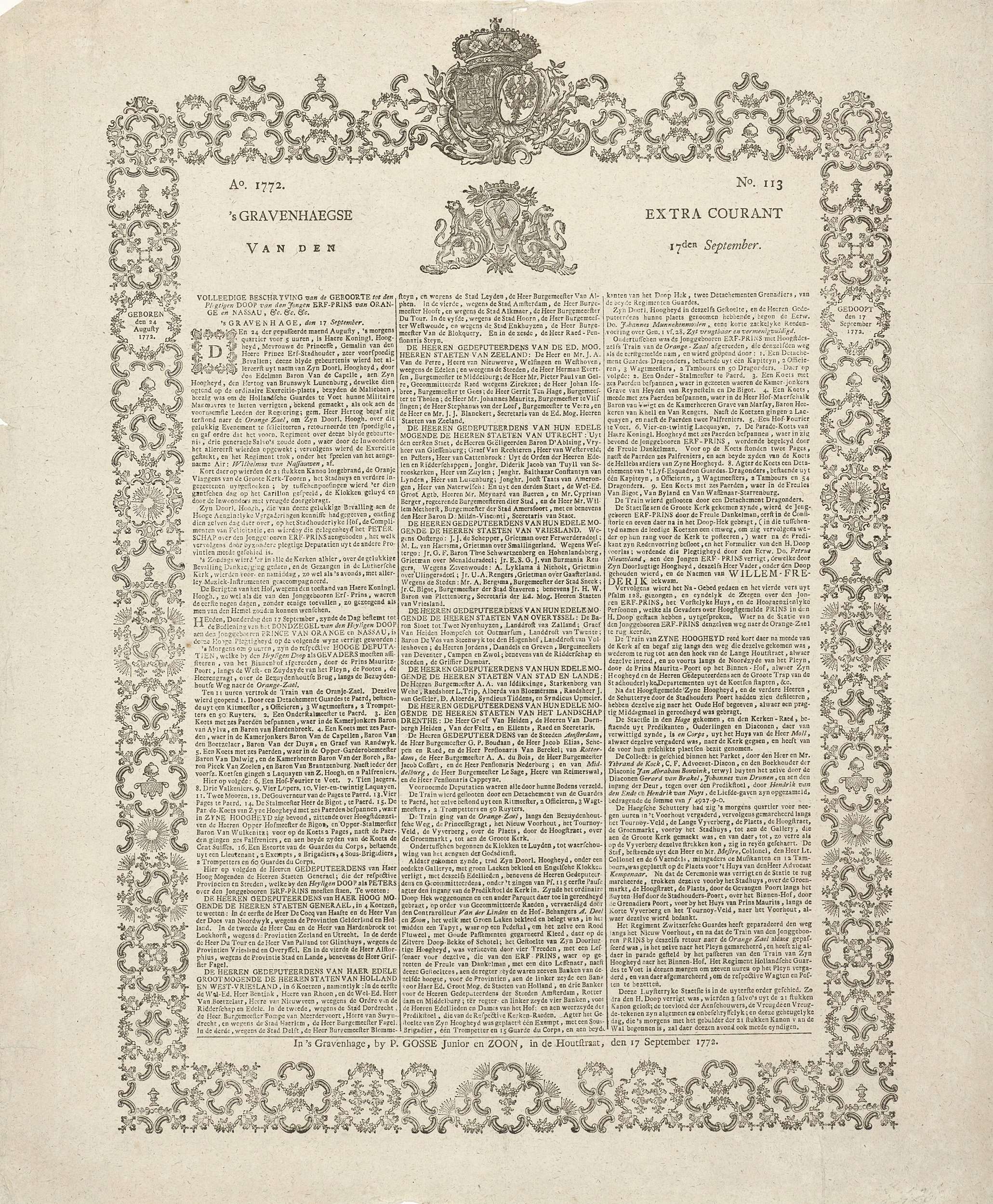 Aflevering nr. 113 van de 's Gravenhaegse Extra Courant van 17 september 1772, naar aanleiding van de doop van prins Willem Frederik. Blad met drie kolommen tekst in een ornamentale rand van fileten en vignetten. Bovenaan vignetten met de gekroonde wapens van de prins en prinses en het stadswapen van Den Haag.