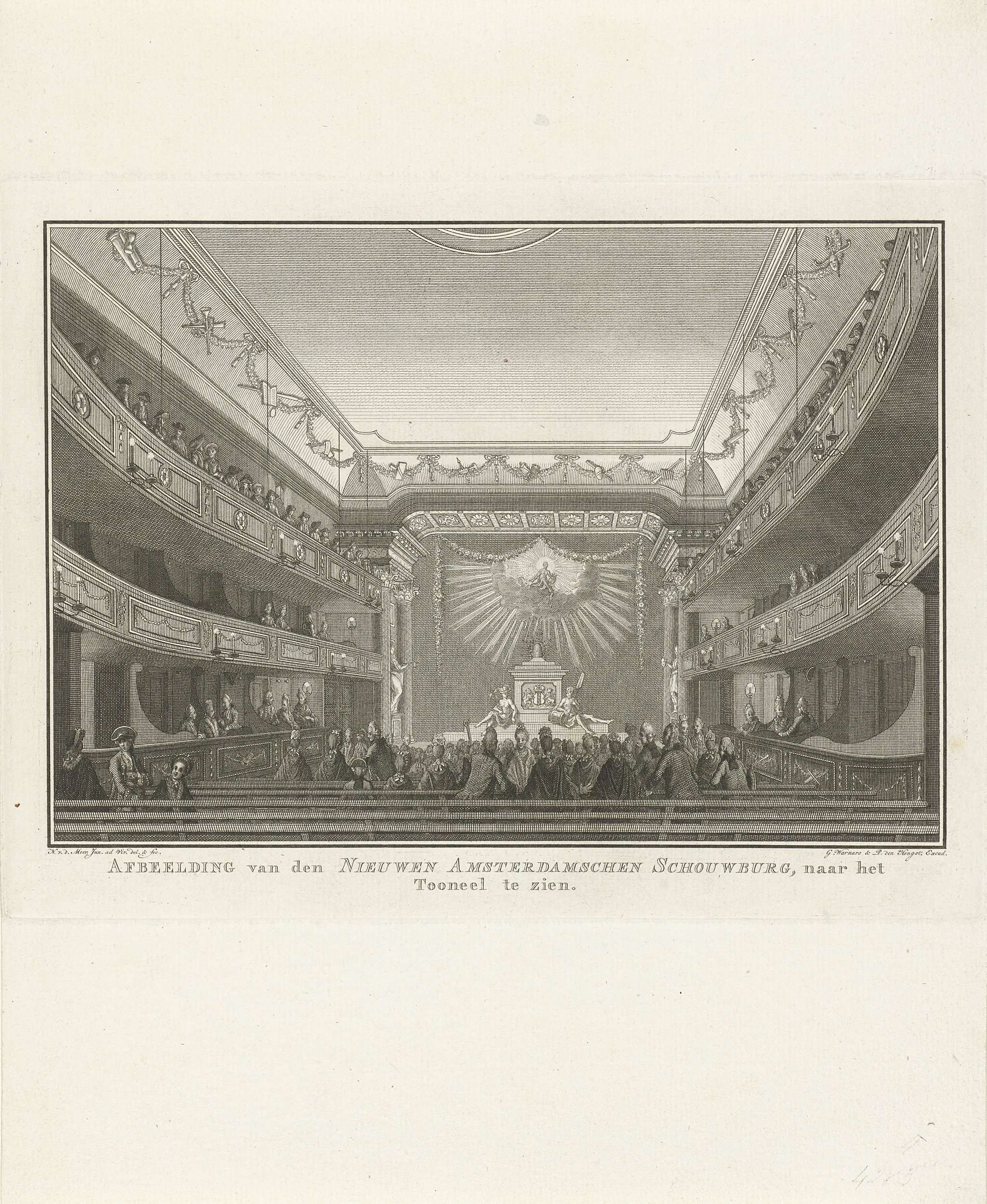 Gezicht op het toneel van de op 15 september 1774 ingewijde Amsterdamse Schouwburg op het Leidseplein, gezien vanuit de zaal. Deze stadsschouwburg werd gebouwd om de in 1772 afgebrande schouwburg aan de Keizersgracht te vervangen en brandde in 1890 zelf af.