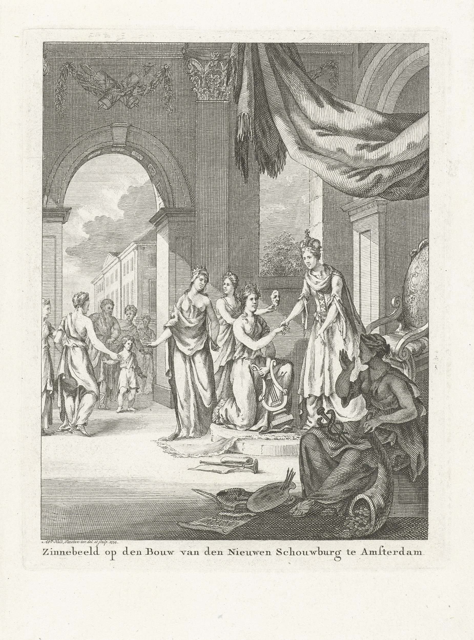 Allegorie op de nieuwe Schouwburg aan het Leidseplein te Amsterdam, ingewijd op 15 september 1774. Personificaties van Toneeldichtkunst, Treurspel en Blijspel zoeken steun bij de Amsterdamse Stadsmaagd die hen troost. In het verschiet het gebouw van de nieuwe Schouwburg, op de voorgrond Overvloed verkregen door Koopmanschap. Bij de prent behoort een blad met de uitleg.