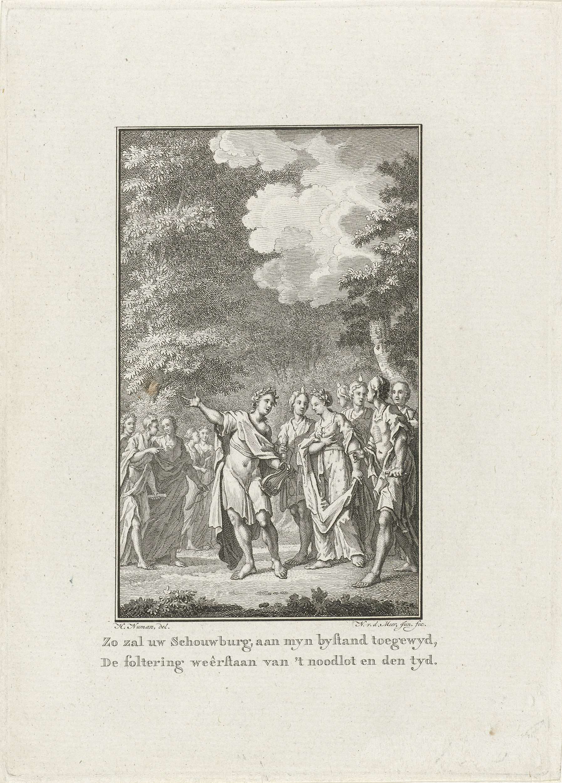 Allegorie op de nieuwe Schouwburg aan het Leidseplein te Amsterdam, ingewijd op 15 september 1774. Apollo spreekt enkele vrouwelijke personificaties gerelateerd aan het toneel toe in het bos.