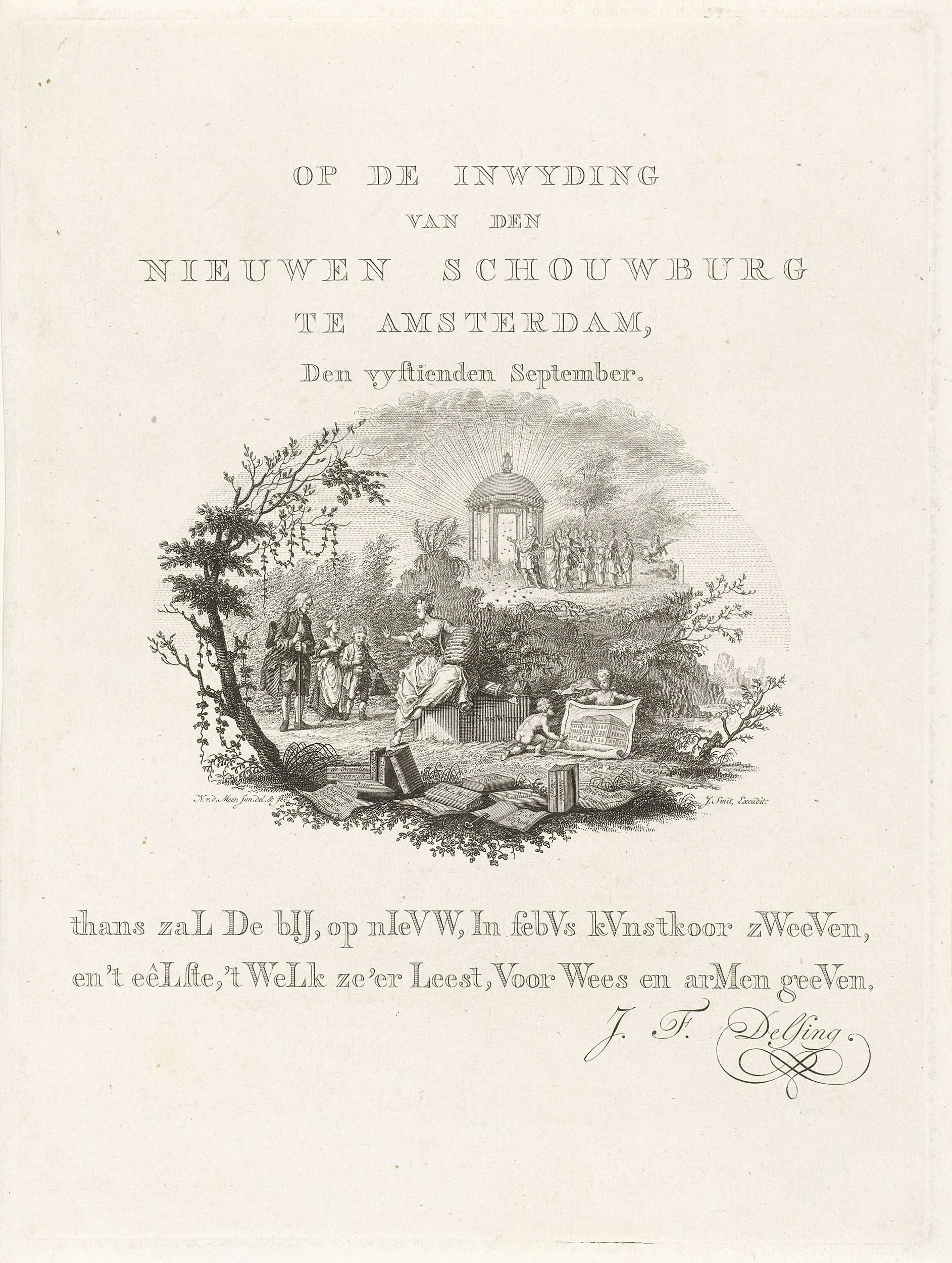 Blad met een ovale allegorische voorstelling en een tweeregelig tijdvers op de inwijding van de nieuwe Amsterdamse Schouwburg op het Leidseplein, 15 september 1774. Deze stadsschouwburg werd gebouwd om de in 1772 afgebrande schouwburg aan de Keizersgracht te vervangen en brandde in 1890 zelf af. In het midden verwelkomt de personificatie van de Amsterdamse Schouwburg, ...
