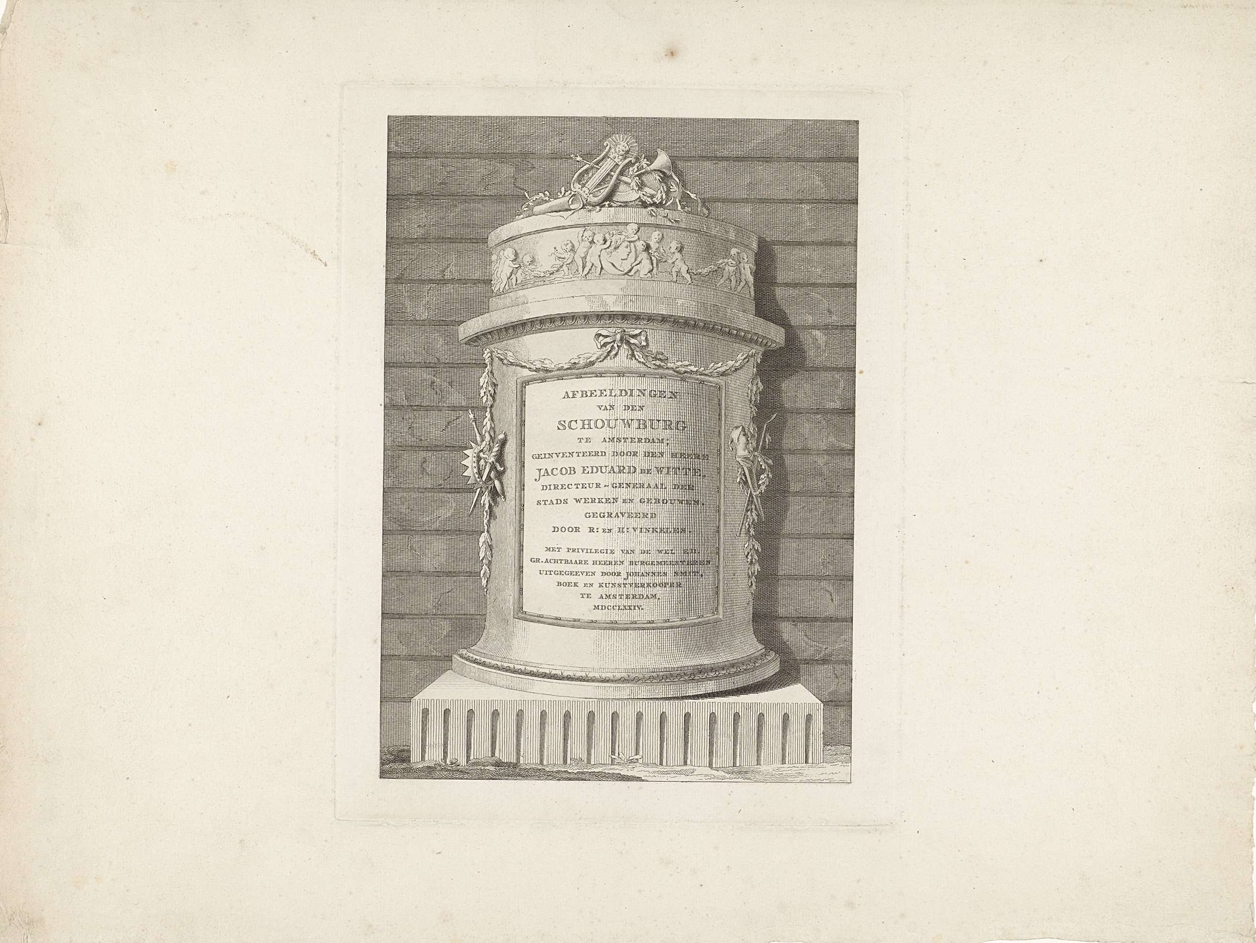 Titelprent voor de prentreeks met veertien platen van de nieuwe Schouwburg te Amsterdam, 1774. Zuil met de titel van de serie en de namen van de betrokken vervaardigers. De zuil versierd met een lier en bazuin, een fries met kindertjes en festoenen.