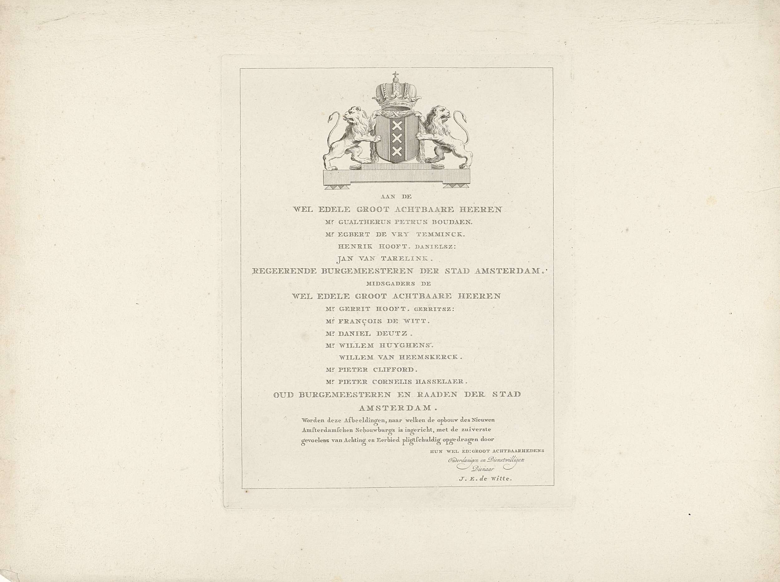 Opdracht aan de burgemeesters, oud-burgemeesters en raden van de stad Amsterdam van de prentreeks met veertien platen van de nieuwe Schouwburg te Amsterdam, 1774. Lijst van namen, bovenaan het stadswapen van Amsterdam.