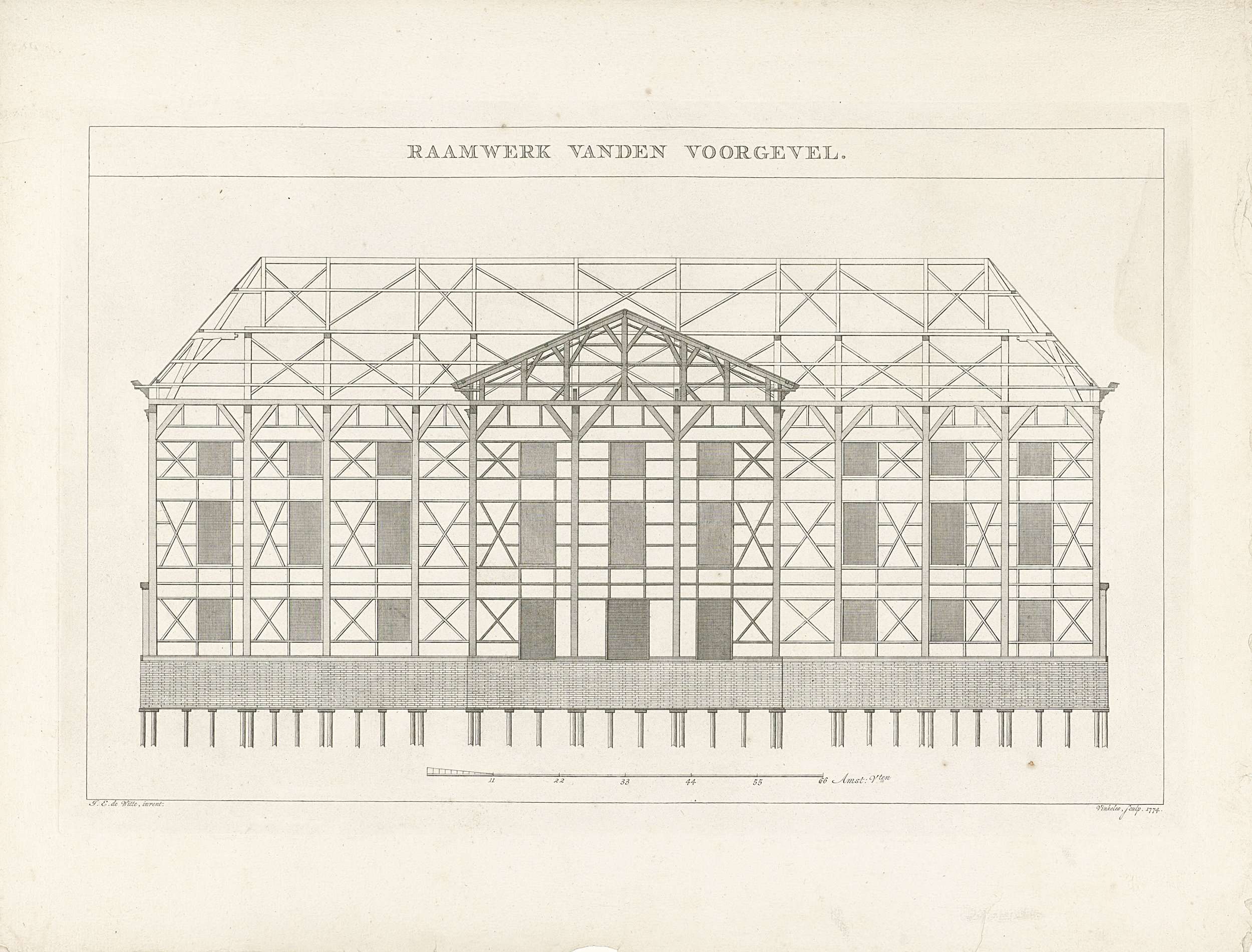 Het houten raamwerk van de voorgevel van de Schouwburg. Onderdeel van een reeks van veertien platen van de nieuwe Schouwburg te Amsterdam, 1774.