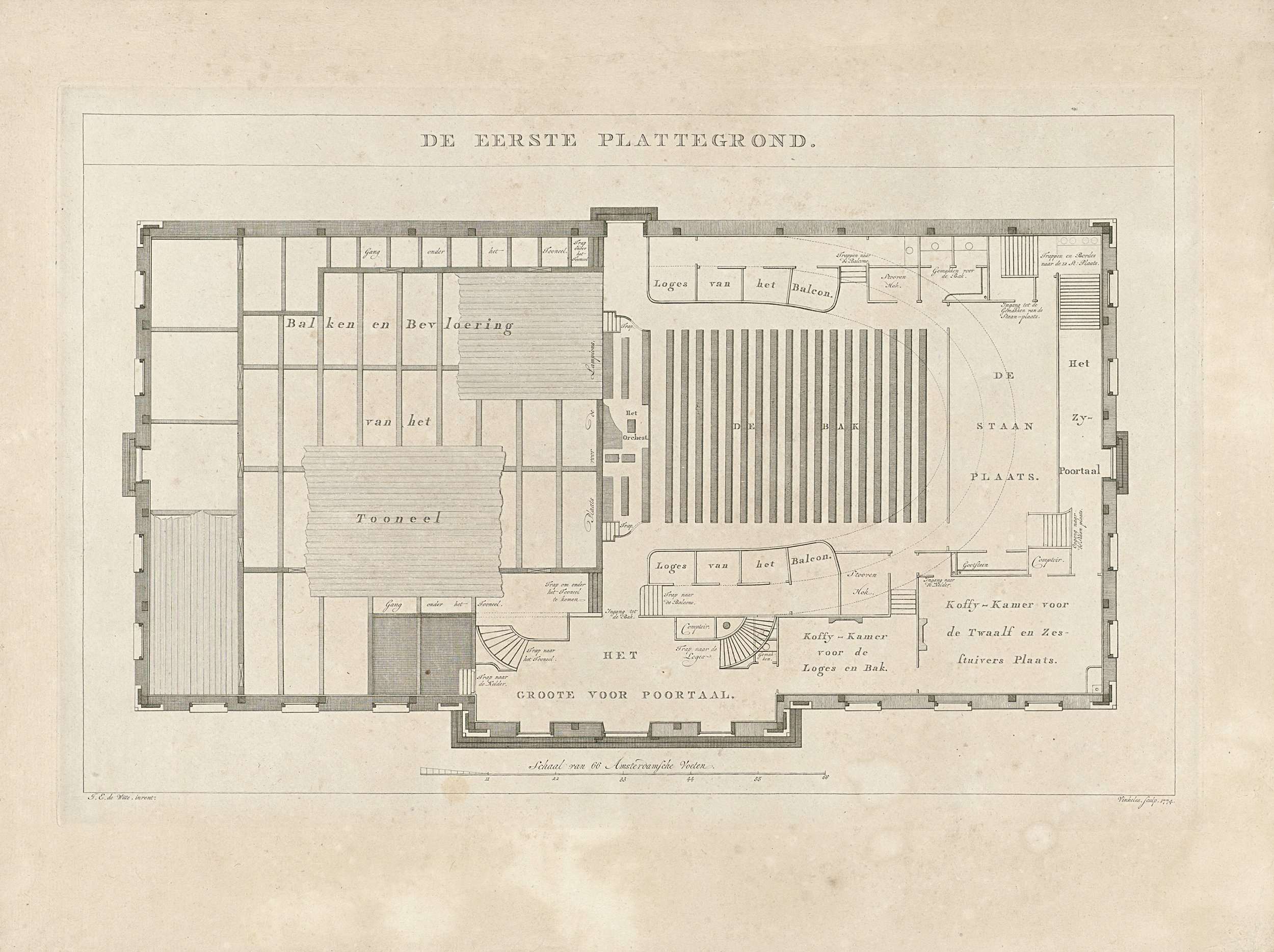 Plattegrond van de begane grond van de Schouwburg. Onderdeel van een reeks van veertien platen van de nieuwe Schouwburg te Amsterdam, 1774.