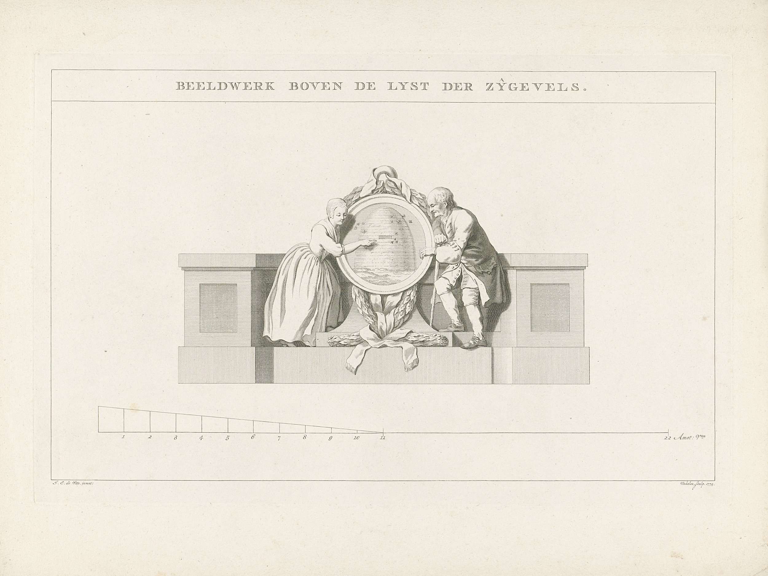 Beeldhouwwerk boven de zijgevels: jonge vrouw en oude man bij een bijenkorf. Onderdeel van een reeks van veertien platen van de nieuwe Schouwburg te Amsterdam, 1774.
