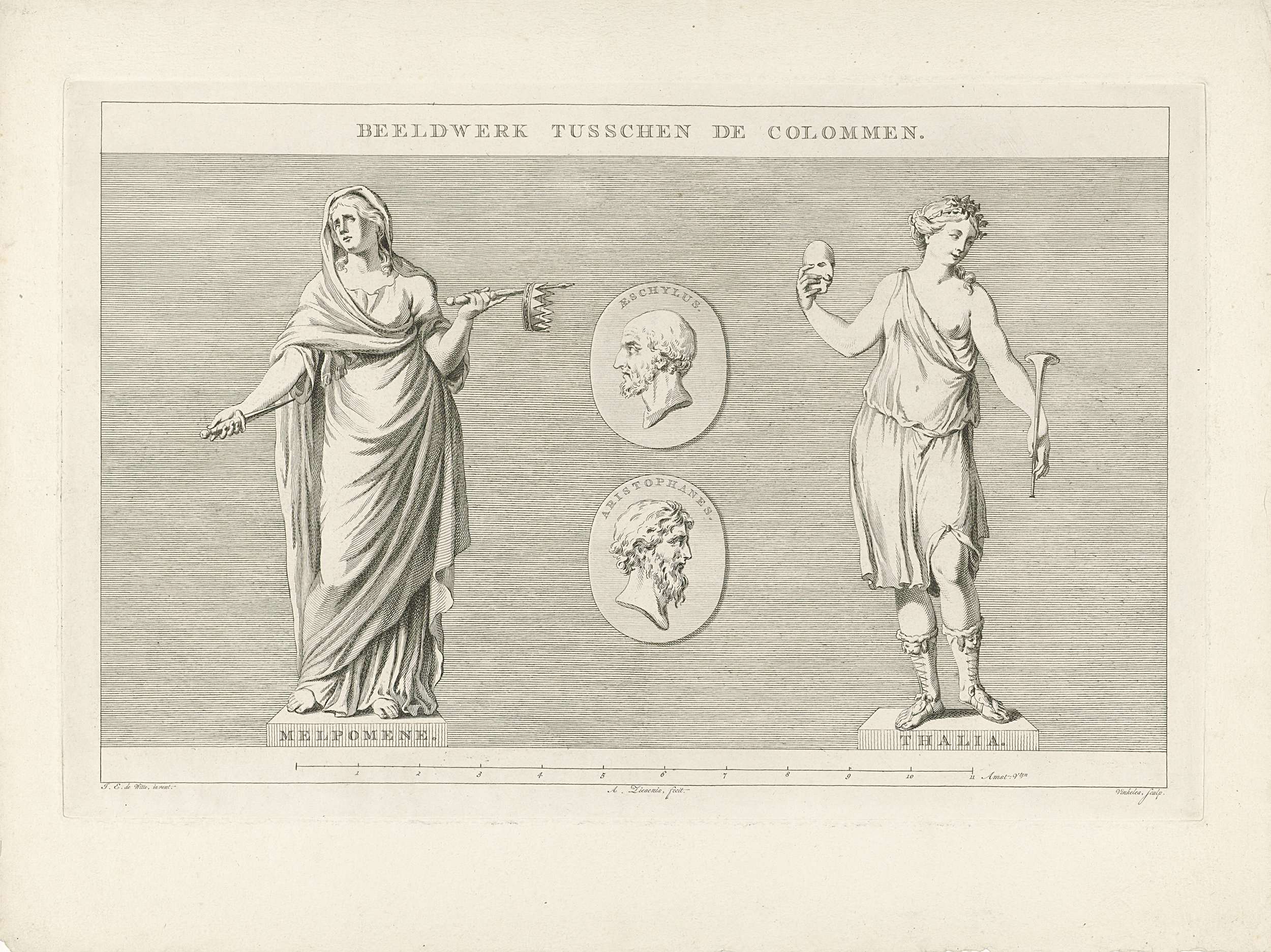 Standbeelden van de muzen Melpomene en Thaleia en medaillons met portretten van de Griekse toneeldichters Aristophanes en Aeschylus (Aischylos). Onderdeel van een reeks van veertien platen van de nieuwe Schouwburg te Amsterdam, 1774.