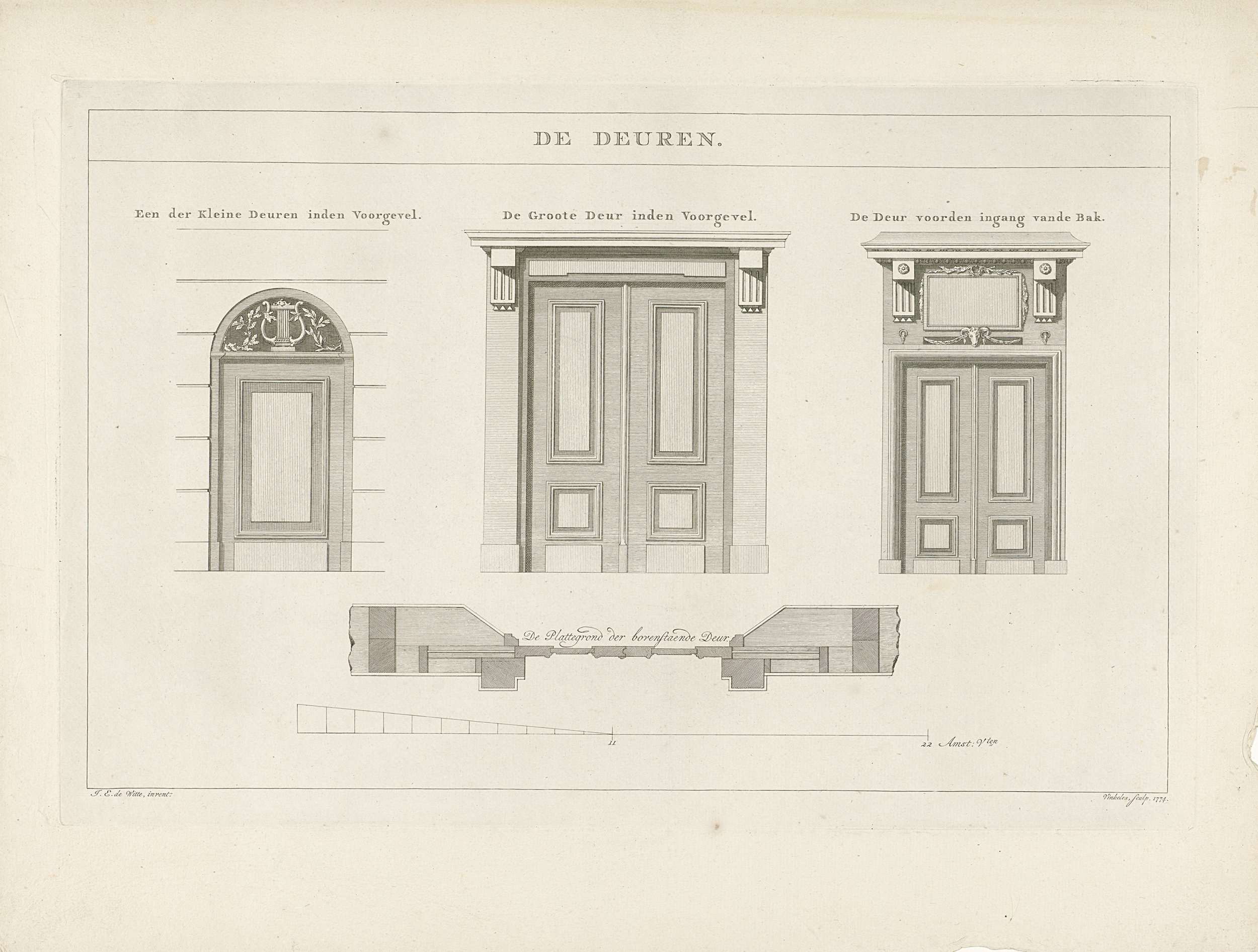 Verschillende typen toegepaste deuren. Onderdeel van een reeks van veertien platen van de nieuwe Schouwburg te Amsterdam, 1774.