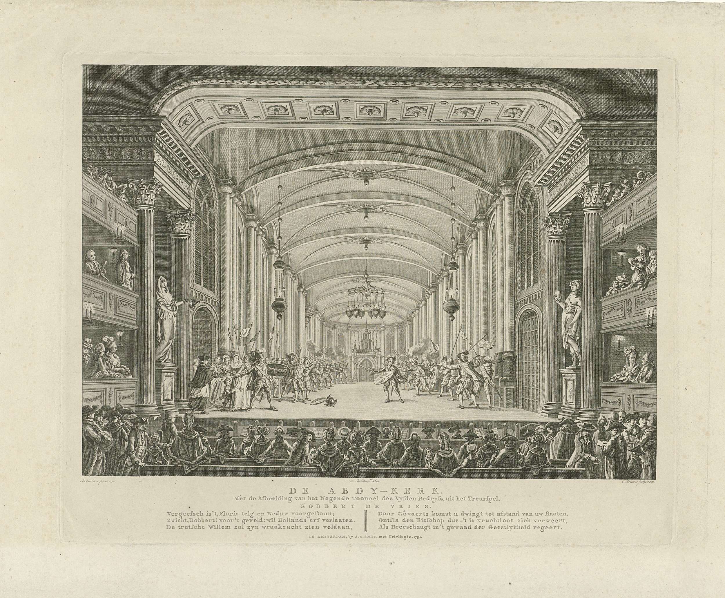 Toneelvoorstelling in de nieuwe Amsterdamse Schouwburg met het coulissendecor De Abdy-kerk met scène uit Robbert de Vries. Het decor gedrukt van een aparte plaat binnen een passe-partout met de zaal, zijloges, pilaren met standbeelden en de façade van het toneel. In het onderschrift een zesregelig vers. Onderdeel van de serie van veertien toneeldecors van de ...