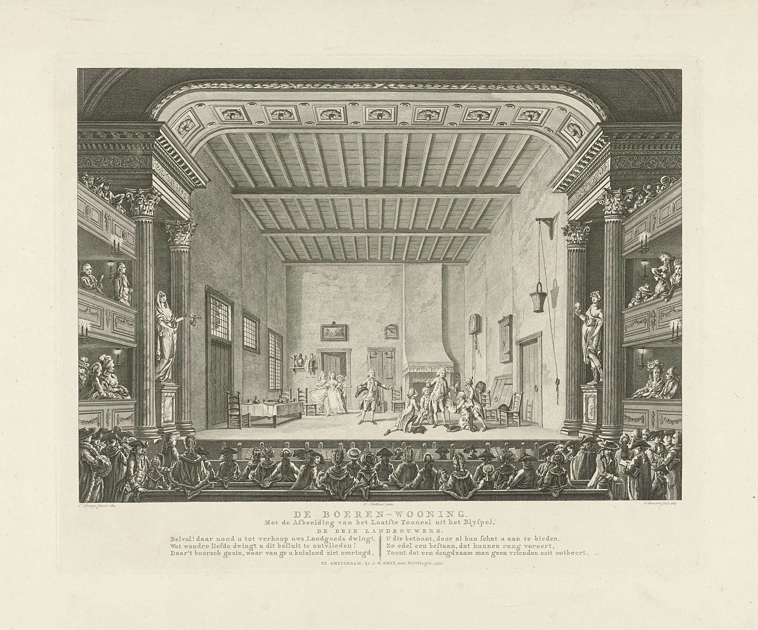 Toneelvoorstelling in de nieuwe Amsterdamse Schouwburg met het coulissendecor De Boeren-wooning, met scène uit De Drie Landbouwers. Het decor gedrukt van een aparte plaat binnen een passe-partout met de zaal, zijloges, pilaren met standbeelden en de façade van het toneel. In het onderschrift een zesregelig vers. Onderdeel van de serie van veertien toneeldecors van de ...