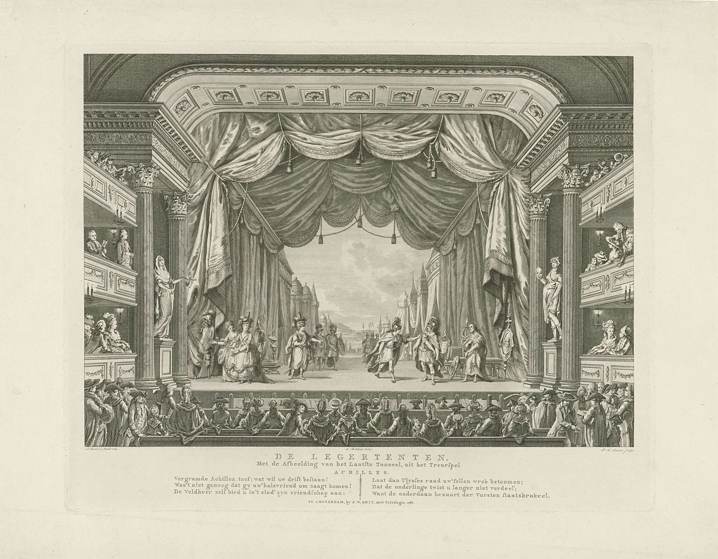 Toneelvoorstelling in de nieuwe Amsterdamse Schouwburg met het coulissendecor De Legertenten, met scène uit Achilles. Het decor gedrukt van een aparte plaat binnen een passe-partout met de zaal, zijloges, pilaren met standbeelden en de façade van het toneel. In het onderschrift een zesregelig vers. Onderdeel van de serie van veertien toneeldecors van de nieuwe Amsterdamse ...