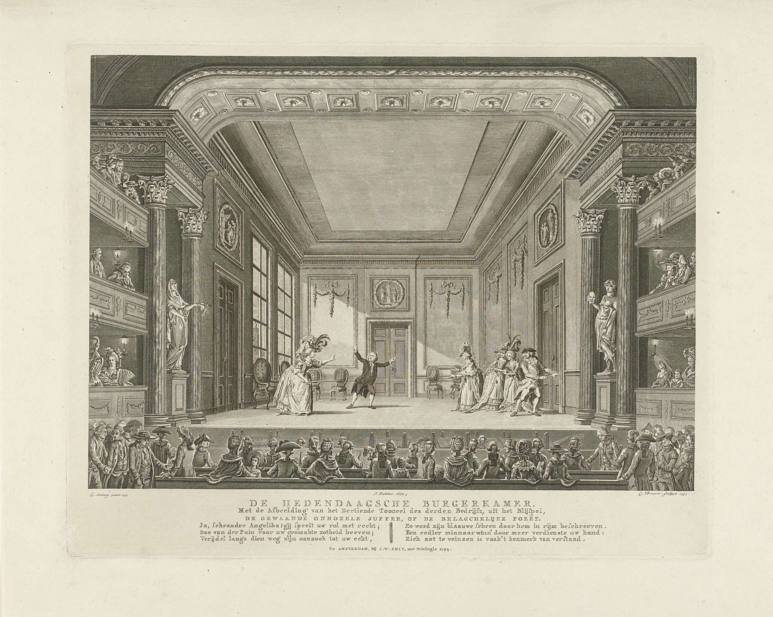 Toneelvoorstelling in de nieuwe Amsterdamse Schouwburg met het coulissendecor De Hedendaagsche Bugerkamer, met scène uit De Gewaande Onnozele Juffer, of De Belagchelijke Poeët. Het decor gedrukt van een aparte plaat binnen een vernieuwde passe-partout met de zaal, zijloges, pilaren met standbeelden en de façade van het toneel. In het onderschrift een zesregelig vers. Onderdeel van ...