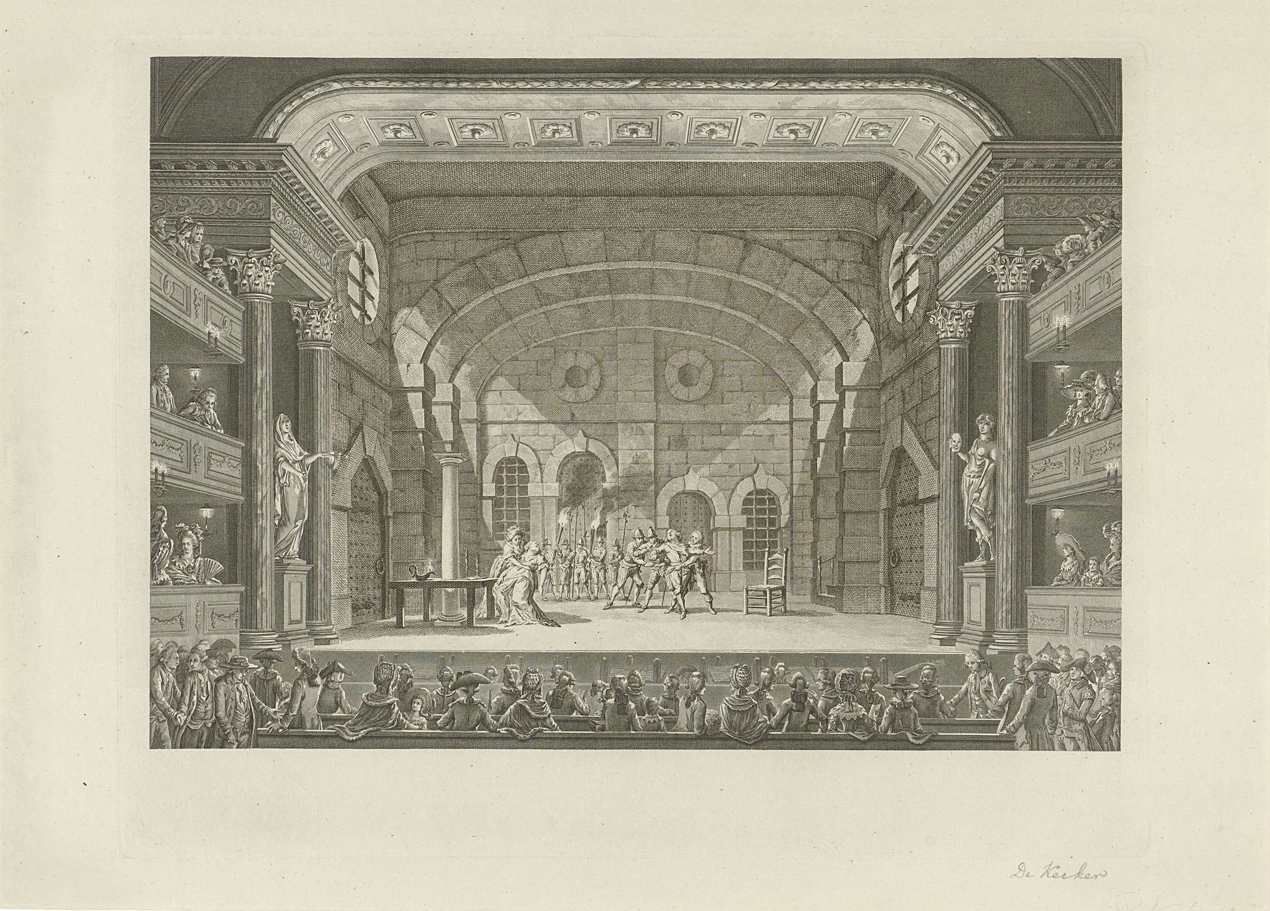 Toneelvoorstelling in de nieuwe Amsterdamse Schouwburg met het coulissendecor De Kerker, met scène uit Gabriëla van Vergij. Het decor gedrukt van een aparte plaat binnen een vernieuwde passe-partout met de zaal, zijloges, pilaren met standbeelden en de façade van het toneel. Onderdeel van de serie van veertien toneeldecors van de nieuwe Amsterdamse Schouwburg, 1787-1794.