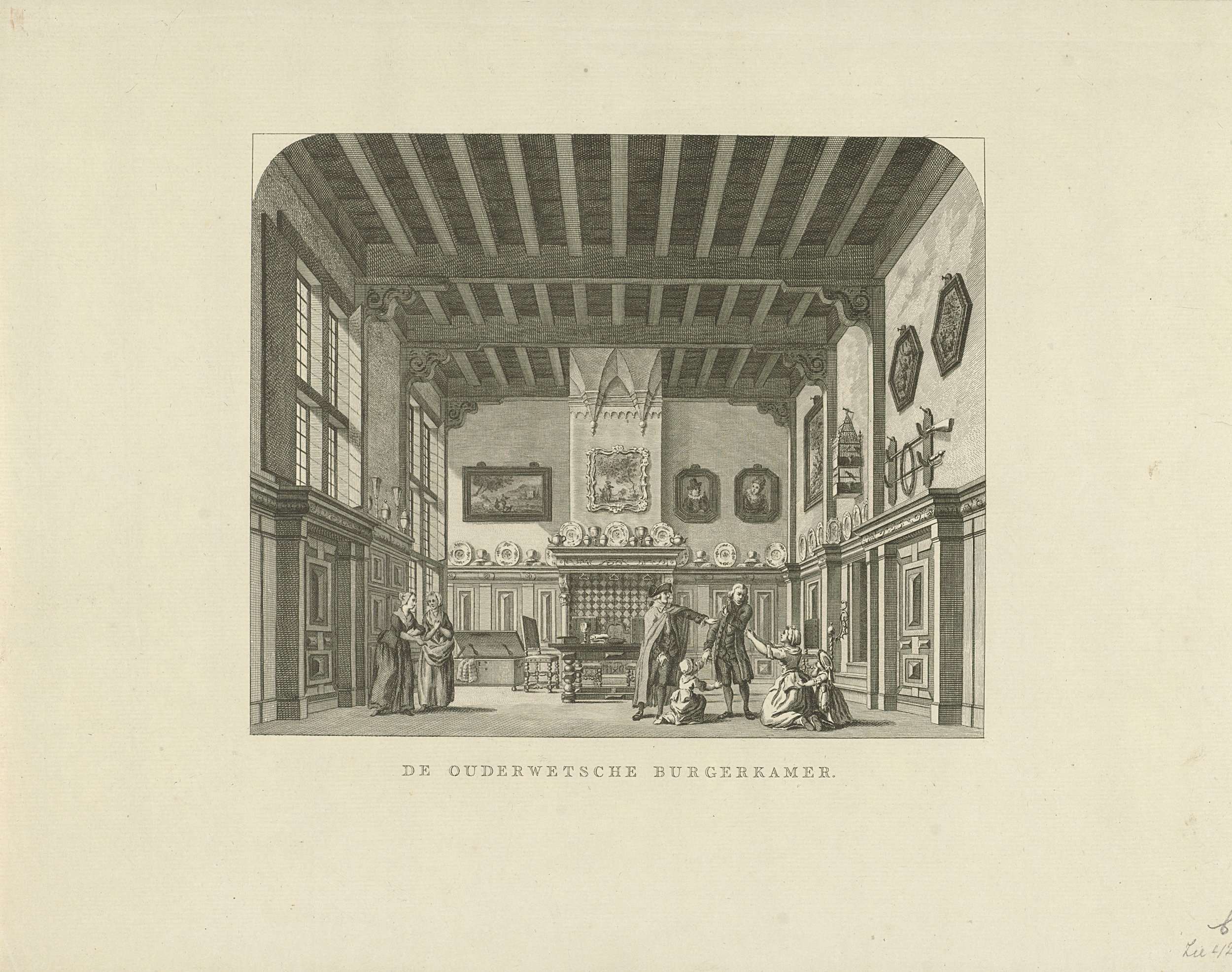 Het coulissendecor De Ouderwetsche Burgerkamer, met scène uit De Stiefmoêr. Aparte afdruk van alleen het decor, zonder de passe-partout met het toneel en de zaal. Behorend bij de serie van veertien toneeldecors van de nieuwe Amsterdamse Schouwburg, 1787-1794.